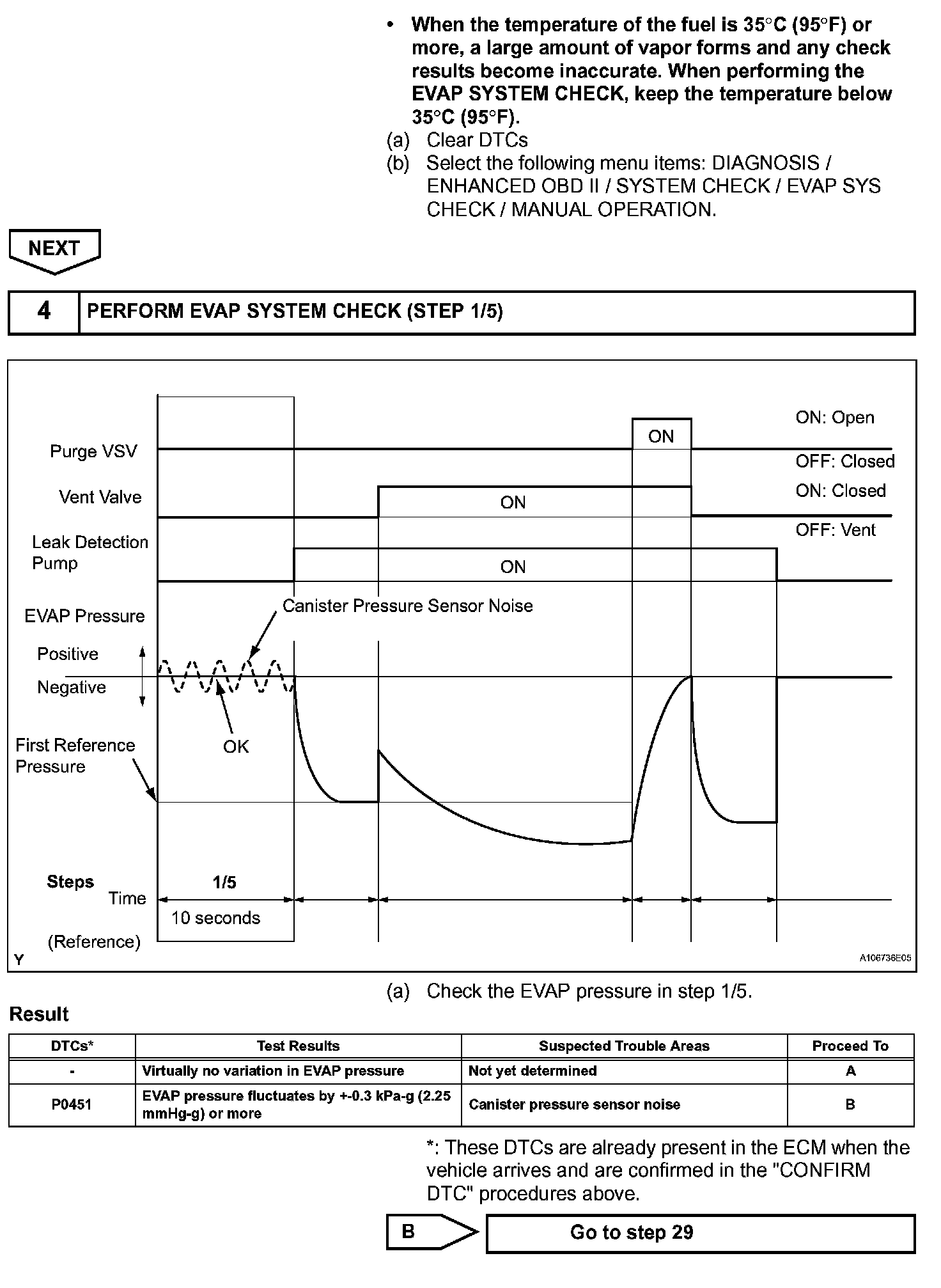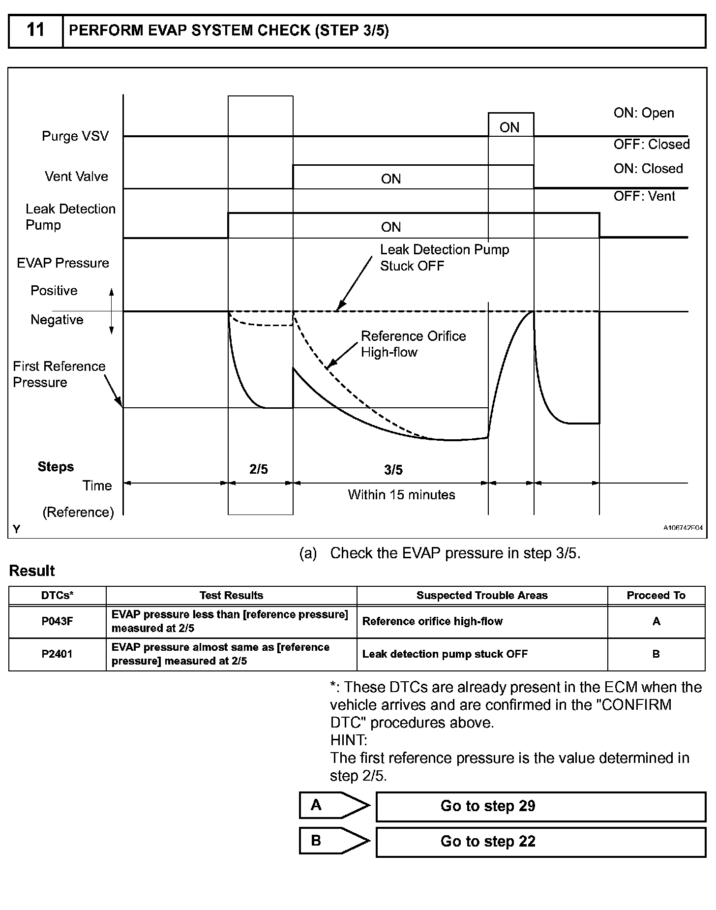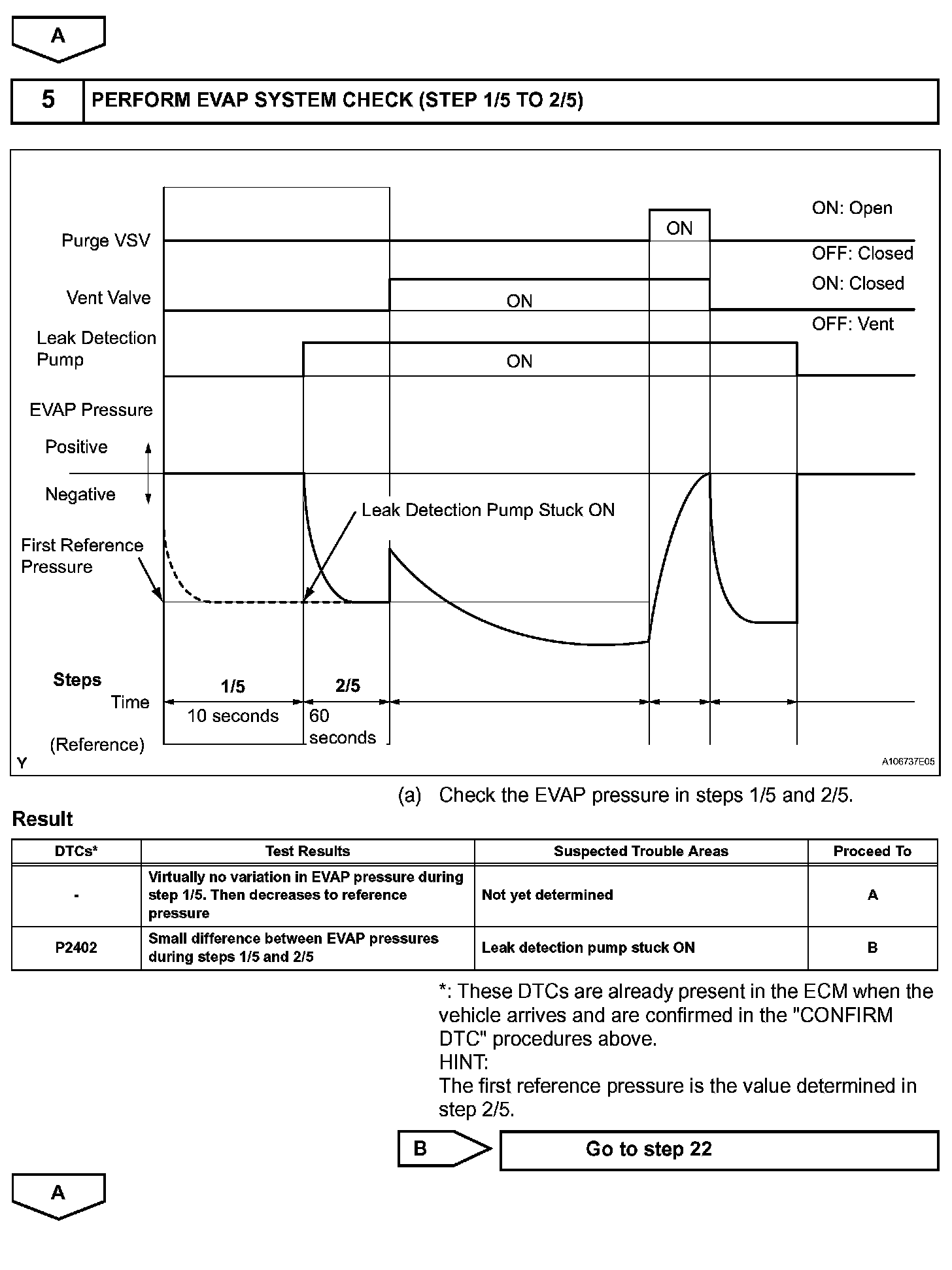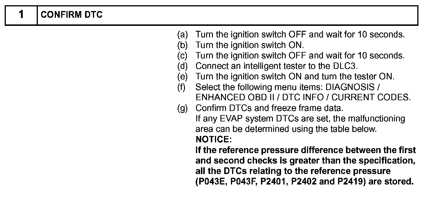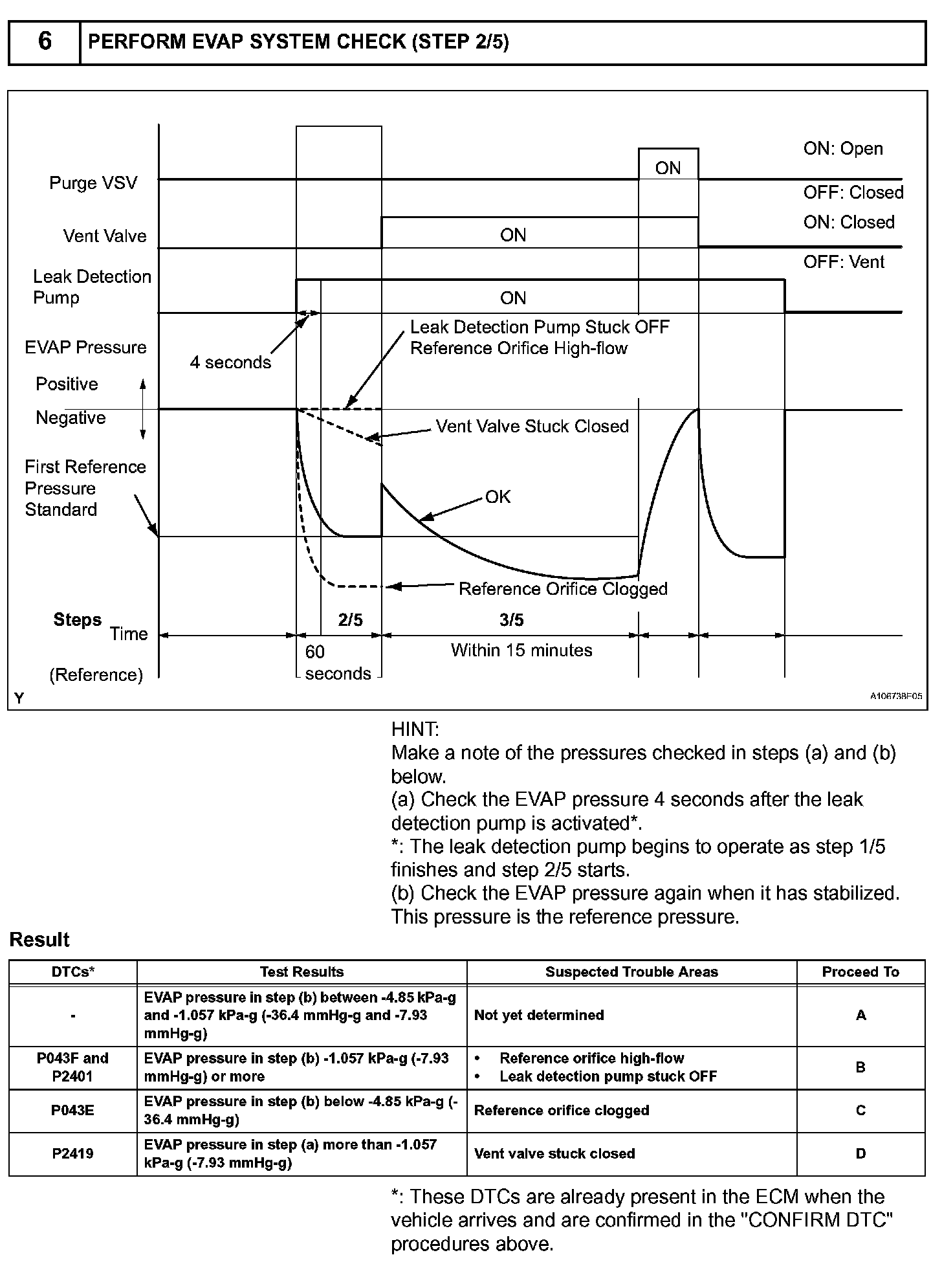 NOTE: If the reference pressure difference between the first and second checks is greater than the specification, all the DTCs relating to the reference pressure (P043E, P043F, P2401, P2402 and P2419) are stored.