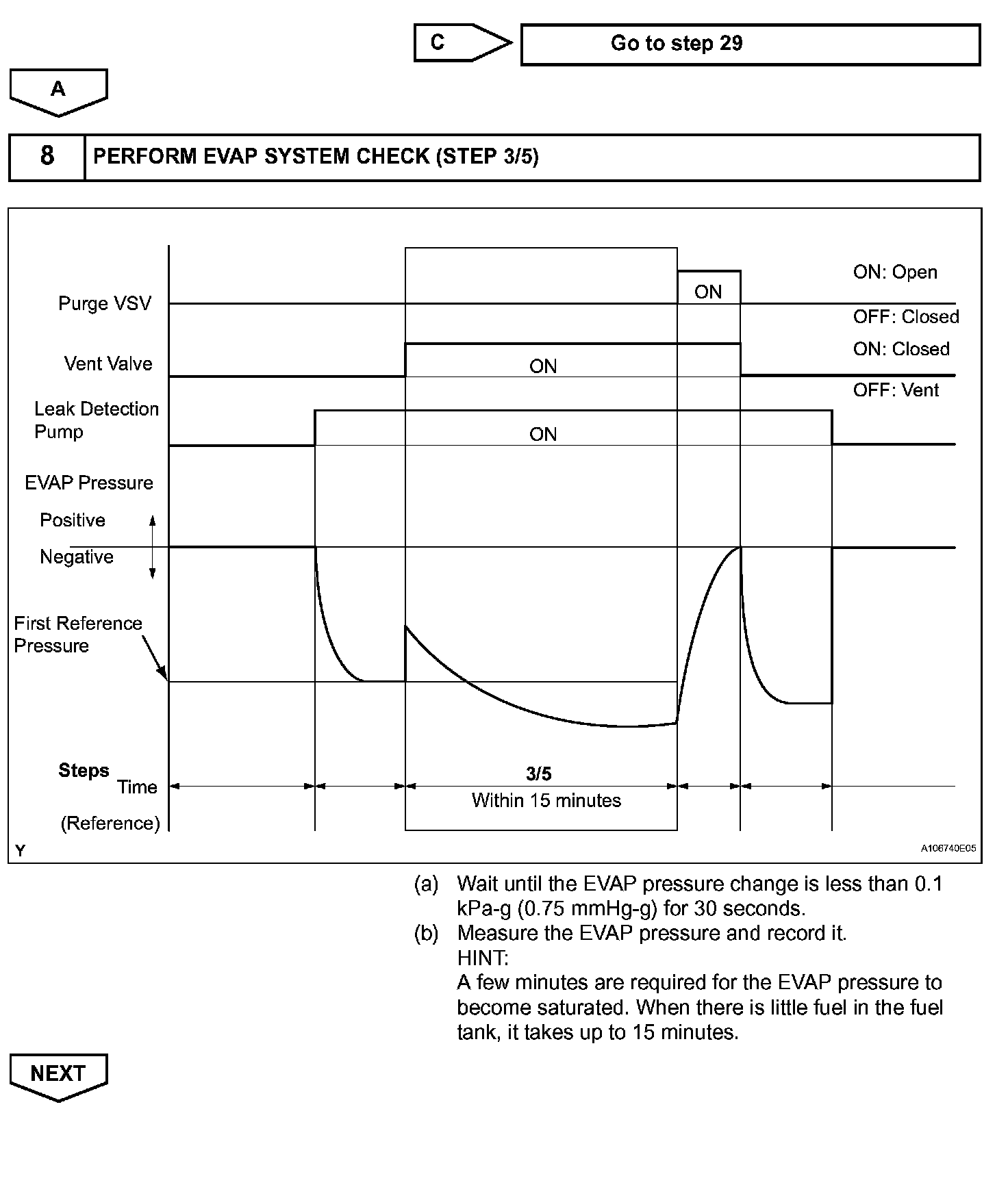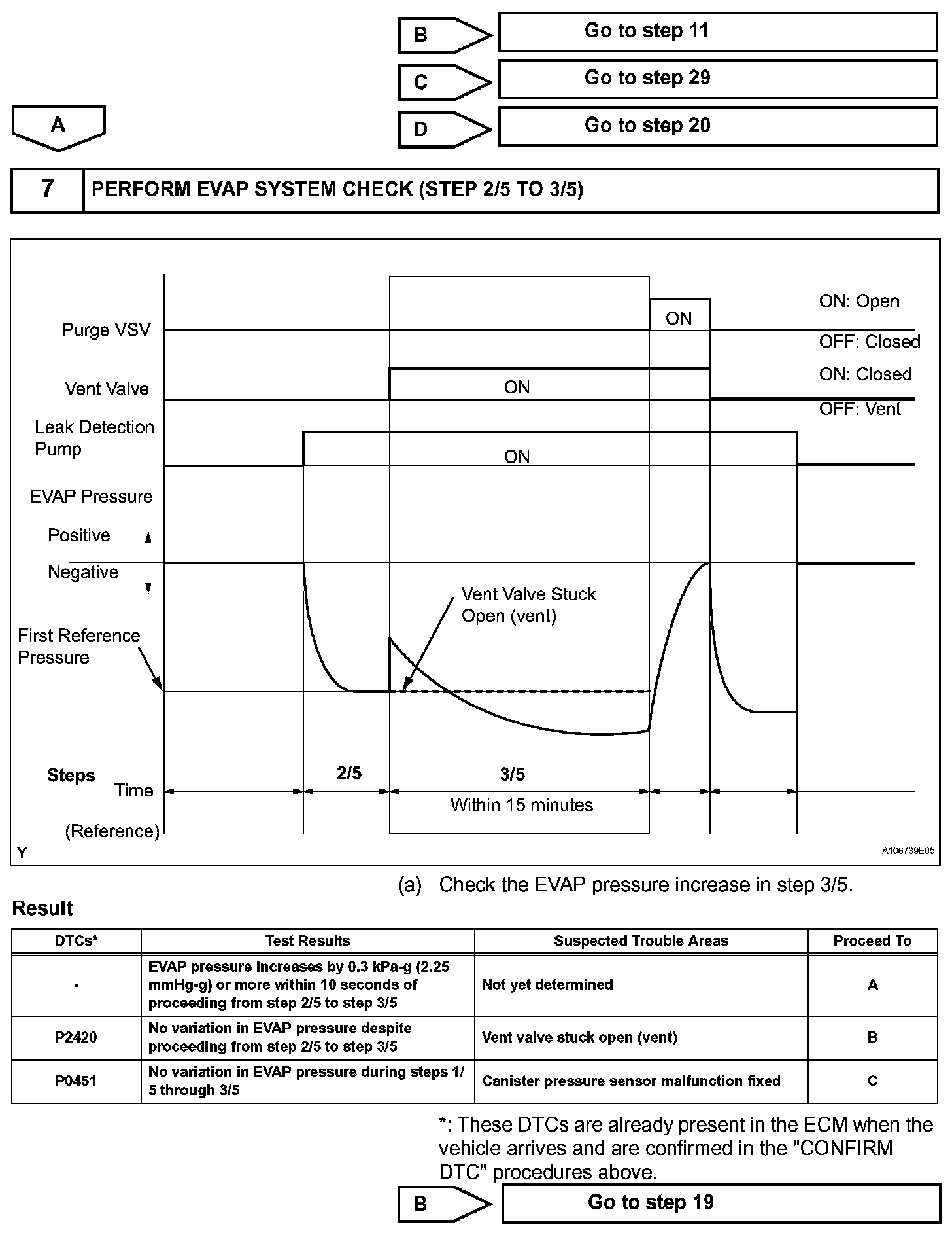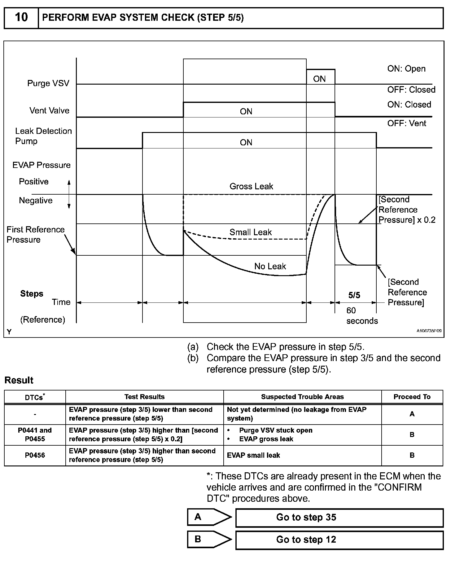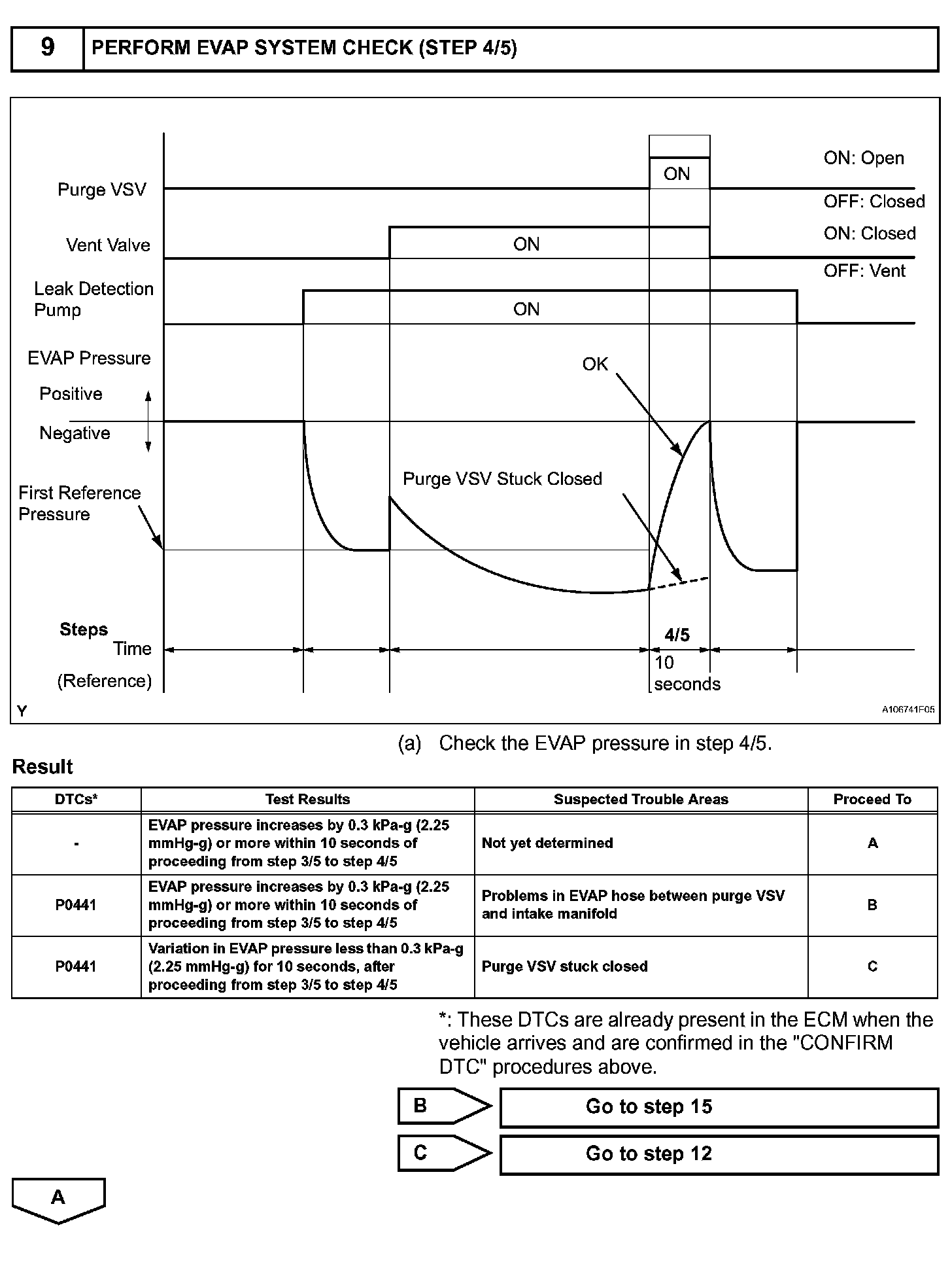 The vent valve is turned OFF (open) and the EVAP pressure is measured. If the variation in the pressure is less than 0.5 kPa-g (3.75 mmHg-g), the ECM interprets this as the purge VSV being stuck closed, and illuminates the MIL and sets DTC P0441 (2 trip detection logic).