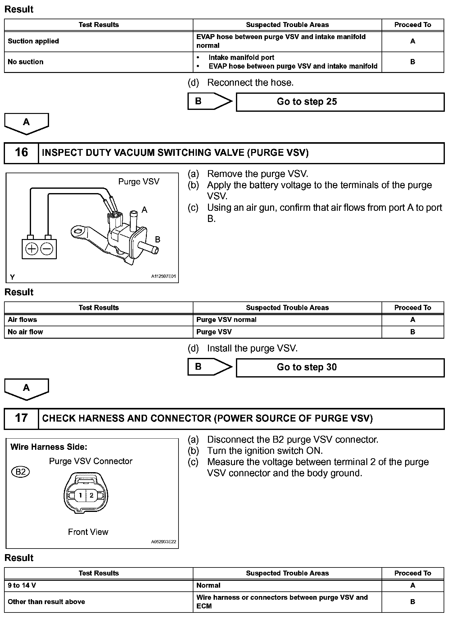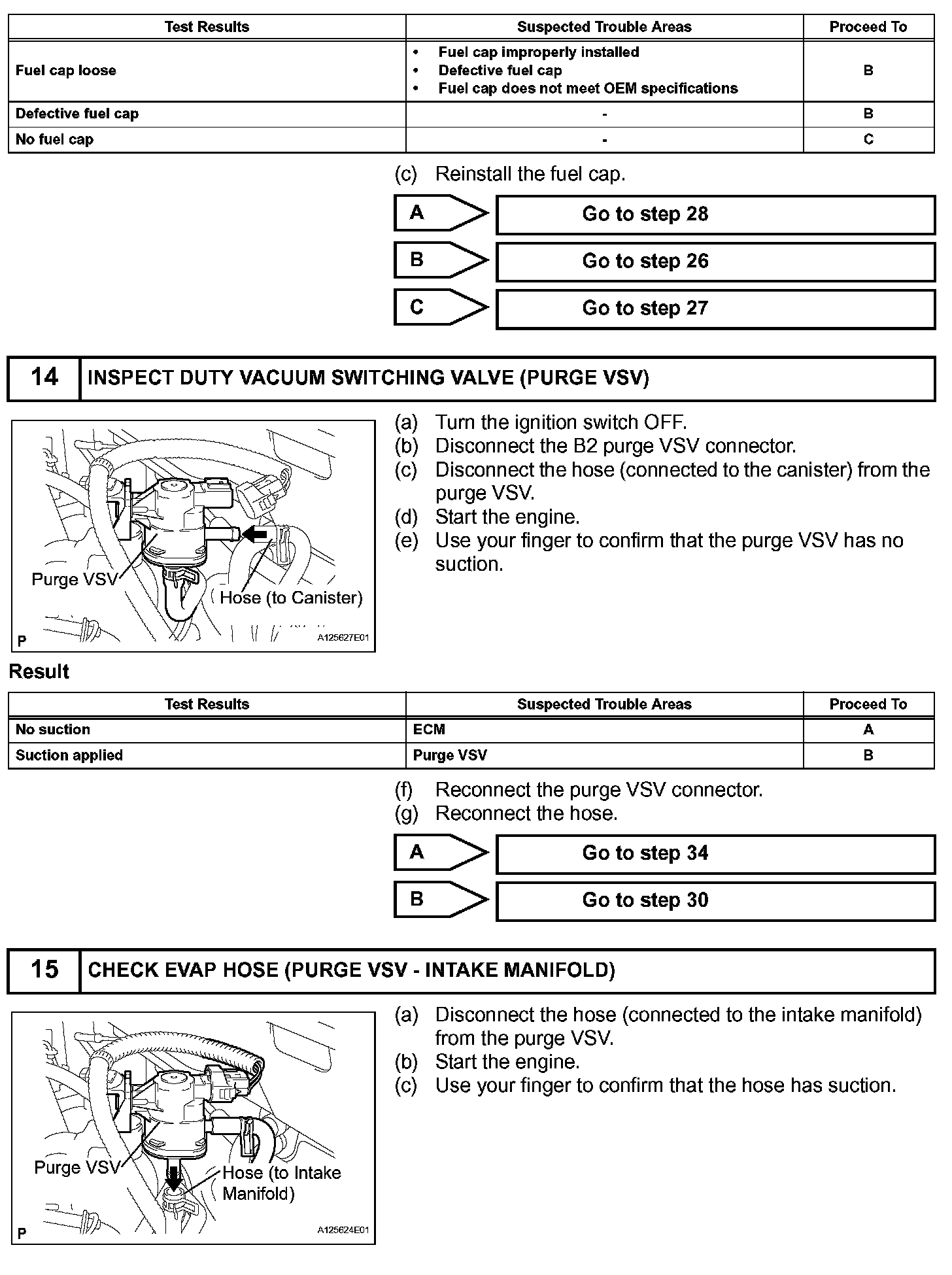 While the engine is running and the purge VSV (Vacuum Switching Valve) is ON (open), the ECM monitors the purge flow by measuring the EVAP pressure change. If negative pressure is not created, the ECM begins the 2nd monitor.
