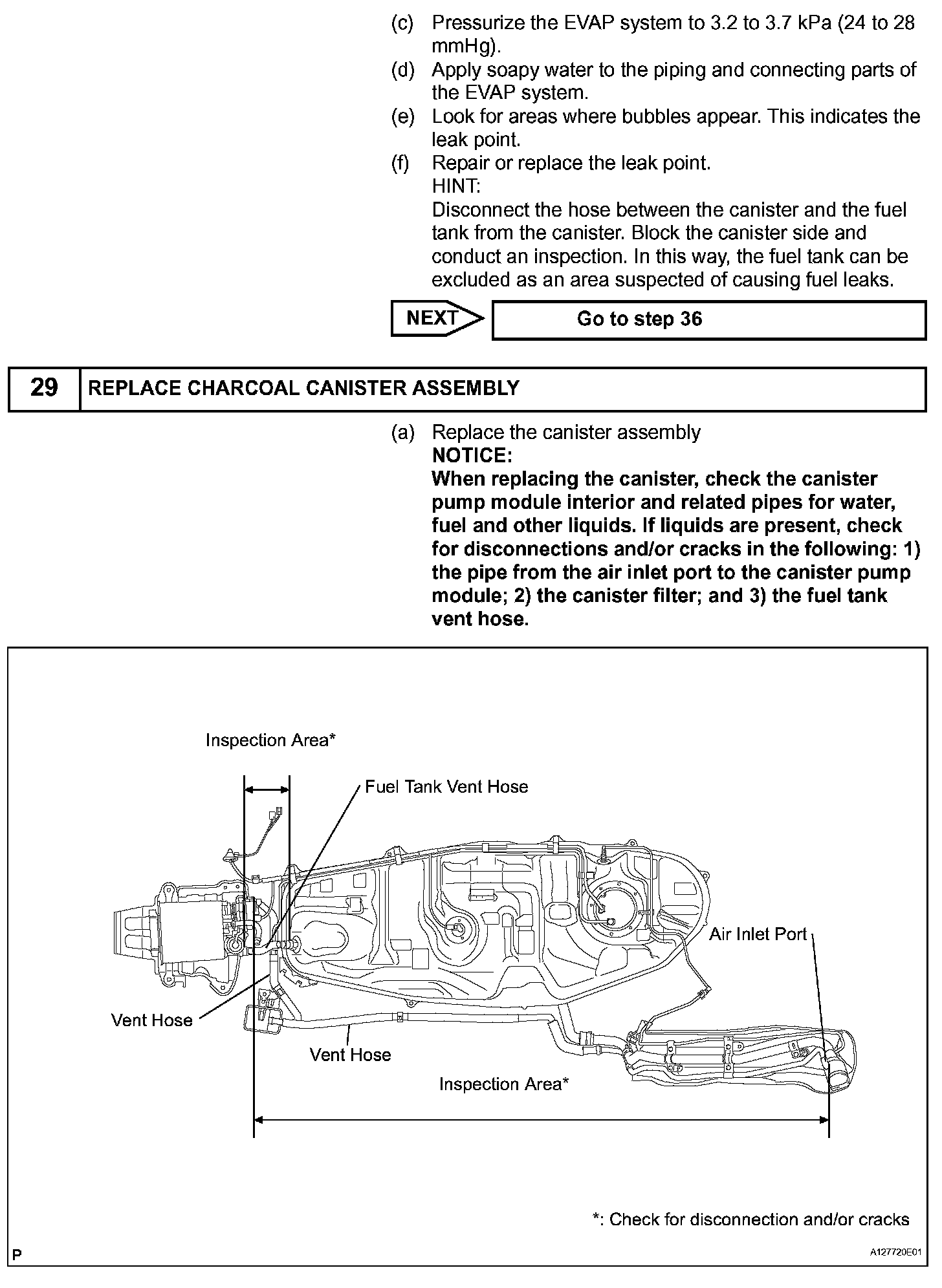 NOTE: In this vehicle's EVAP system, turning ON the vent valve does not seal off the EVAP system. To check for leaks in the EVAP system, disconnect the air inlet vent hose and apply pressure from the atmospheric side of the canister.