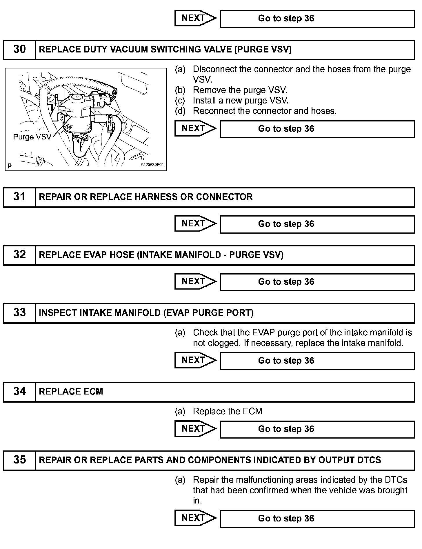 While the engine is running, if a predetermined condition (closed-loop, etc.) is met, the purge VSV is opened by the ECM and stored fuel vapors in the canister are purged into the intake manifold. The ECM changes the duty cycle ratio of the purge VSV to control purge flow volume.