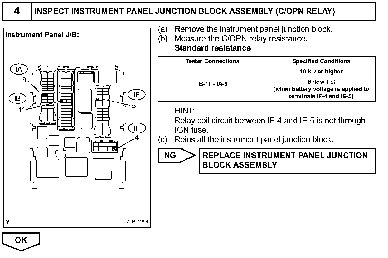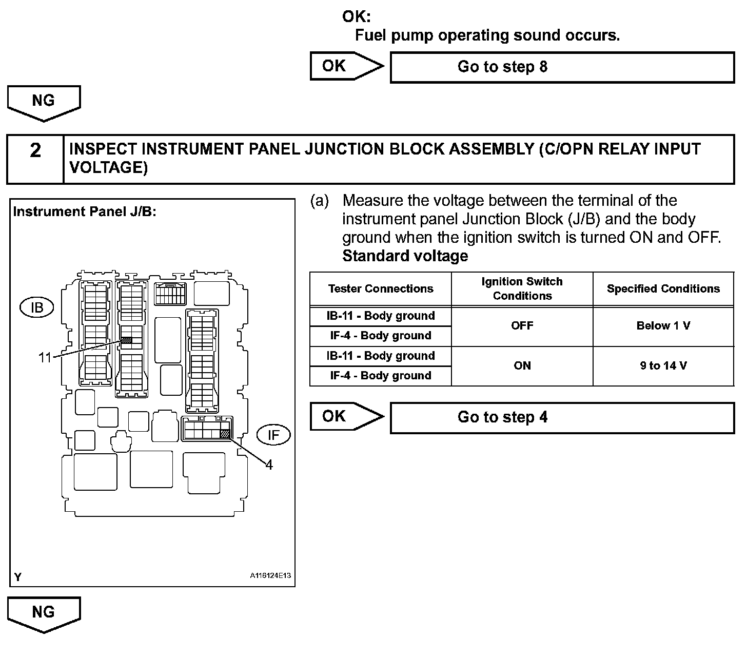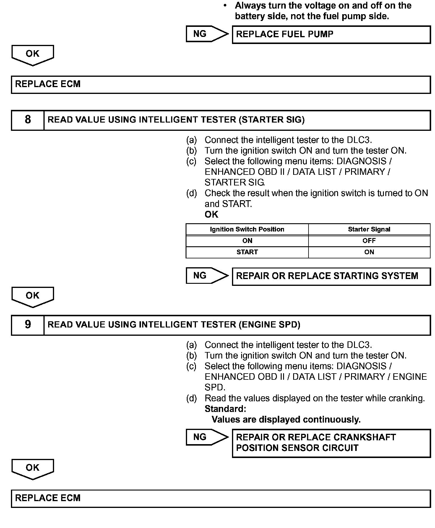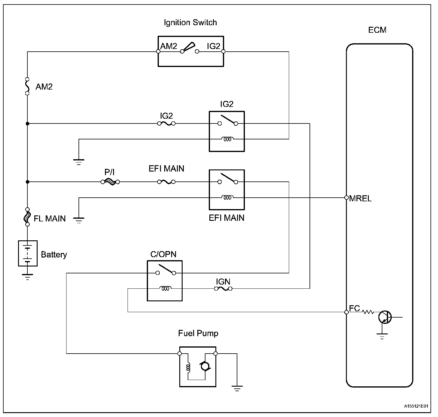 When the engine is cranked, the starter relay drive signal output from the STAR terminal of the ECM is input into the STA terminal of the ECM, and NE signal generated by the crankshaft position sensor is also input into the NE+ terminal. Thus, the ECM interprets that the engine is cranked, and turns the transistor Tr1 in the ECM internal circuit ON. The current flows to the C/OPN (Circuit Opening) relay by turning the Tr1 ON. Then, the fuel pump operates.