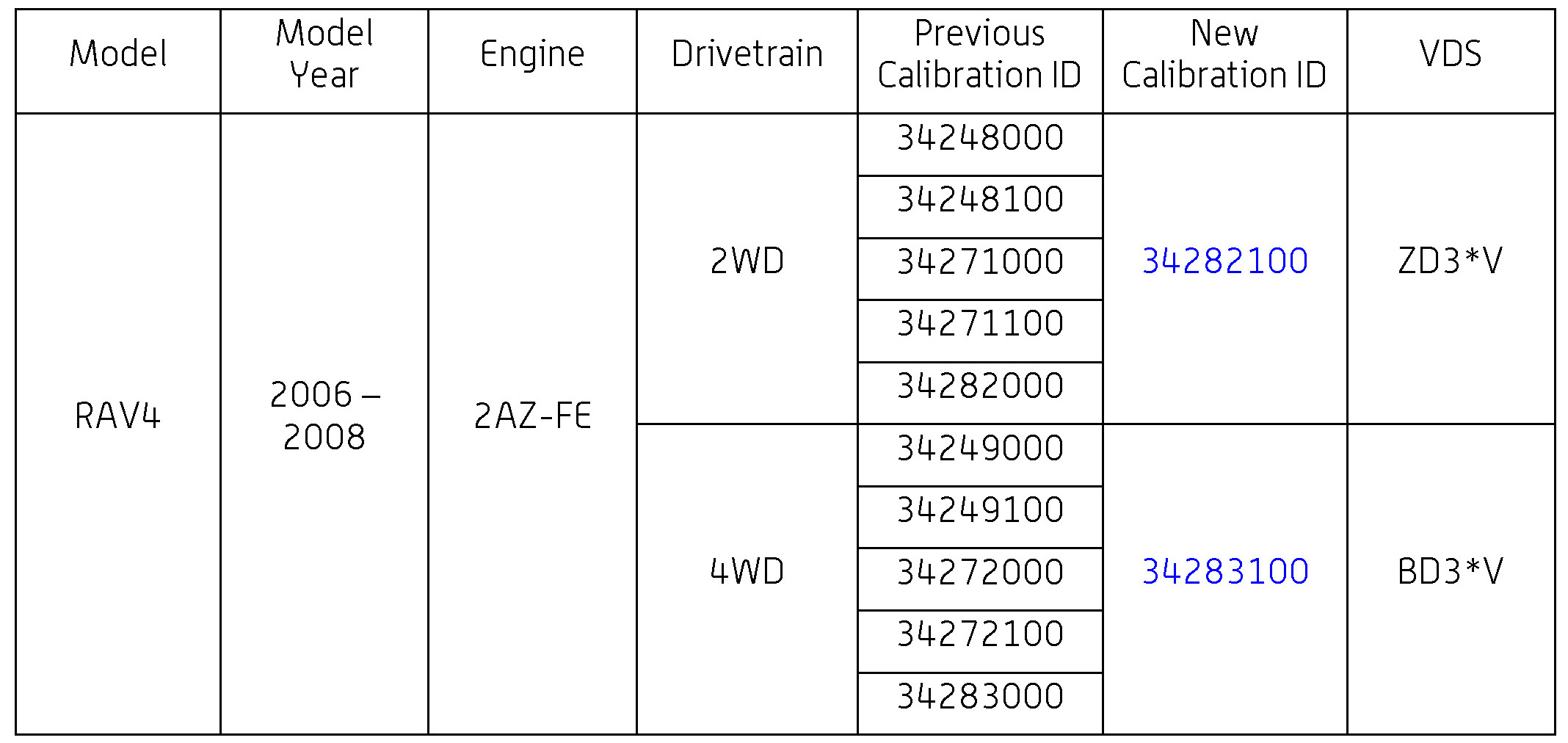 Some 2006 - 2008 model year RAV4 vehicles equipped with the 2AZ-FE engine may exhibit a condition while using the cruise control between 50 - 70 mph (80-113 km/h]. During this condition the transaxle will upshift and downshift frequently. The Engine Control Module [ECM] logic has been updated to improve this condition. Use the following repair procedure for customer complaint vehicles.