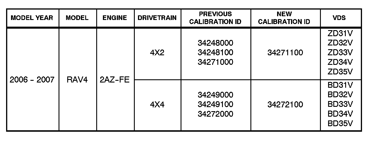 ^ 2006 - 2007 model year RAV4 vehicles equipped with 2AZ-FE engine and 4-speed automatic transmission and produced BEFORE the Production Change Effective VINs below.