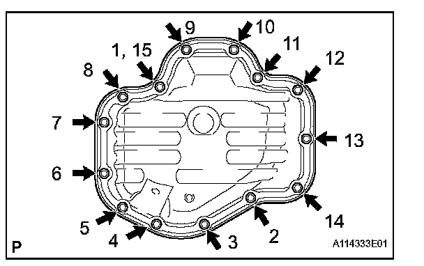Uniformly tighten the 12 bolts and 2 nuts in the sequence shown in the illustration.