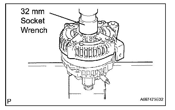 c. Using a 32 mm socket wrench and press, slowly push the generator drive end frame onto the generator rectifier end frame.