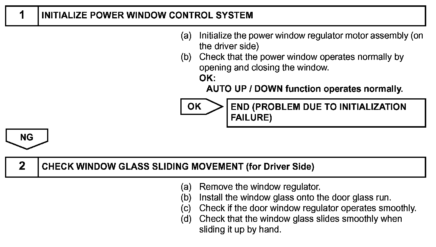 - When the power window regulator motor assembly (on the driver side) is reinstalled or replaced, the power window control system must be initialized.