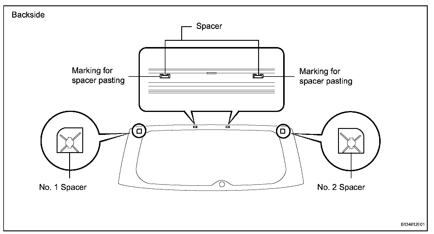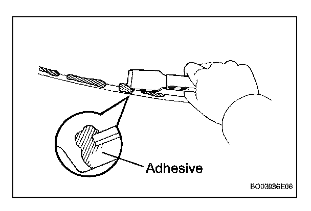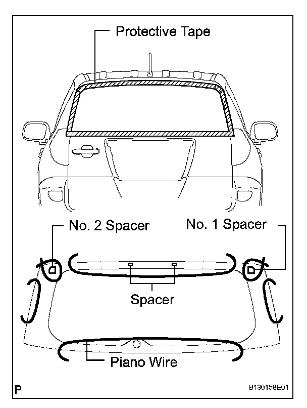 1. Hold the back window glass in place securely with tape or equivalent until the adhesive has hardened.