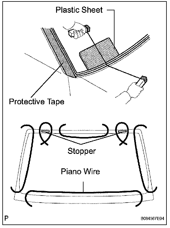 c. From the interior, insert a piano wire between the vehicle body and glass as shown in the illustration.