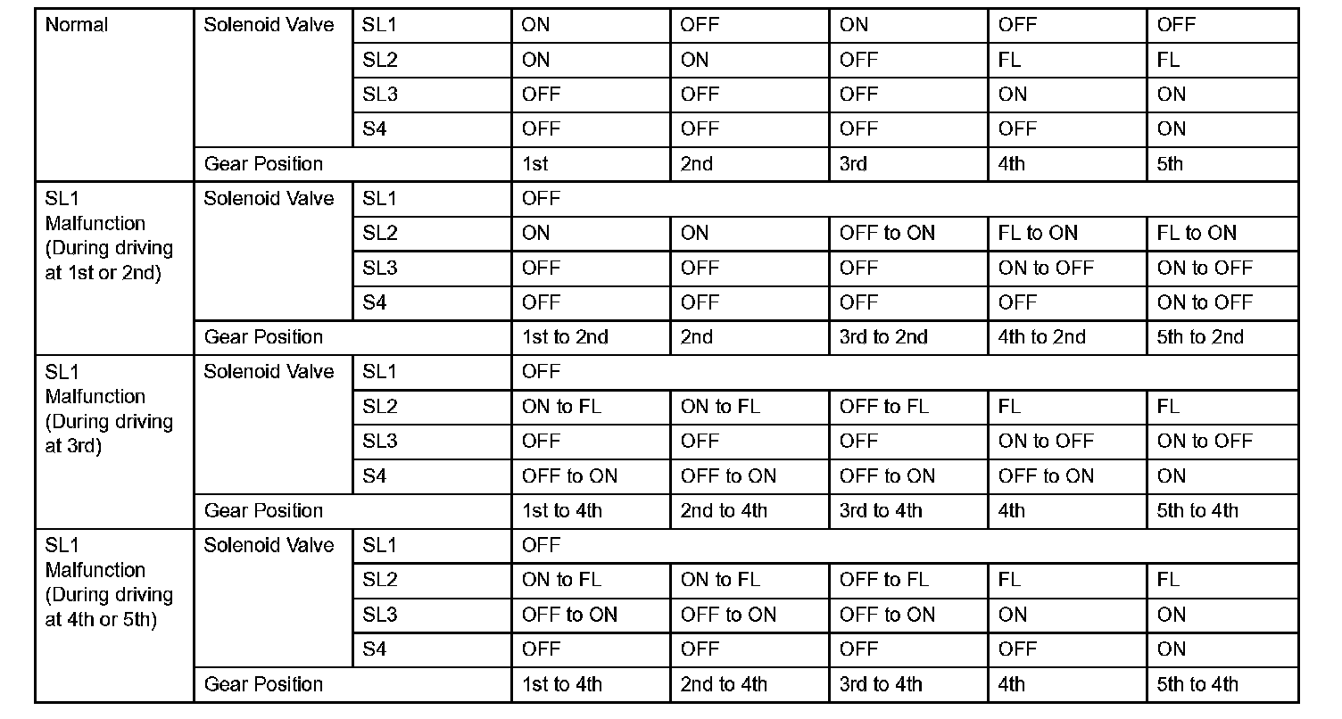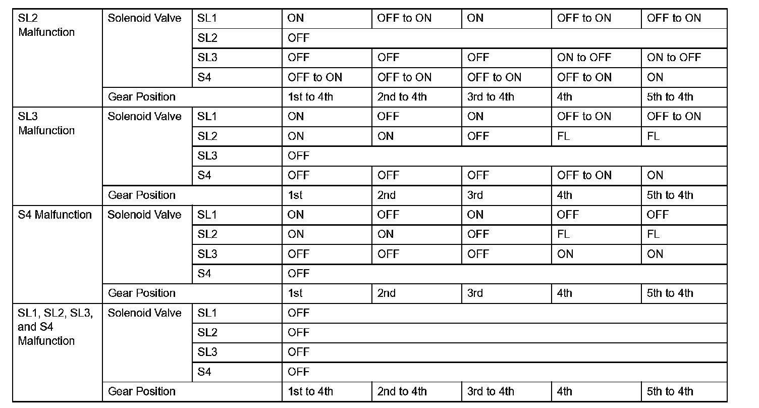 (d) Shift solenoid valve SL1, SL2, SL3 and S4: If any of the shift solenoid valve circuits develops an open or short, the ECM turns the other shift solenoid "ON" and "OFF" in order to shift into the gear positions shown in the table.