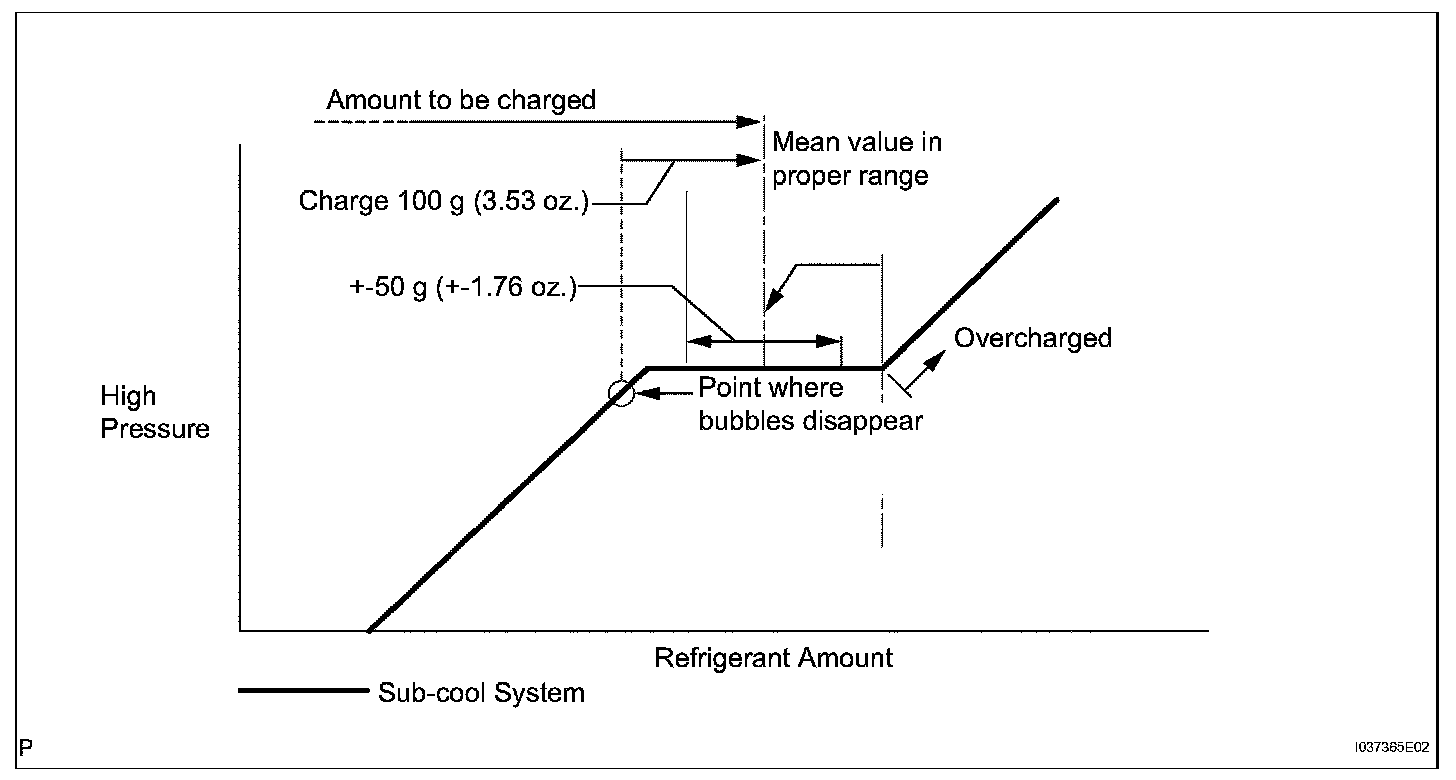 - Approximately 100 g (3.53 oz.) of refrigerant may need to be charged after bubbles disappear. The refrigerant amount should be checked by measuring its quantity, and not with the sight glass.