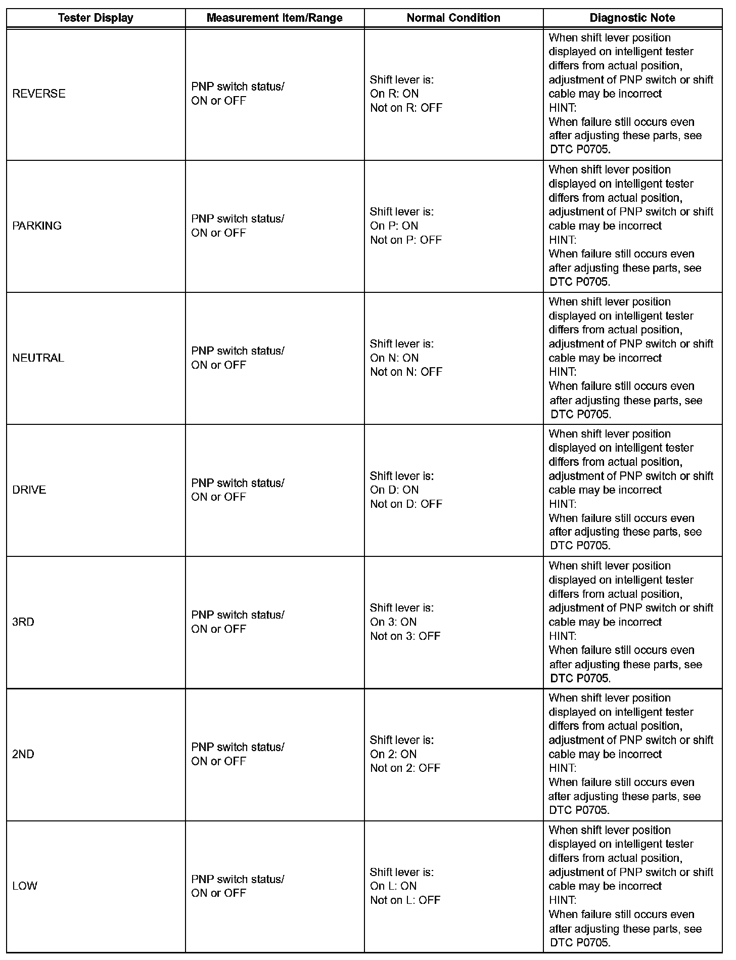 HINT: Using the intelligent tester's DATA LIST allows switch, sensor, actuator, and other item values to be read without removing any parts. Reading the DATA LIST early in troubleshooting is one way to save time.