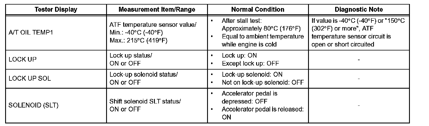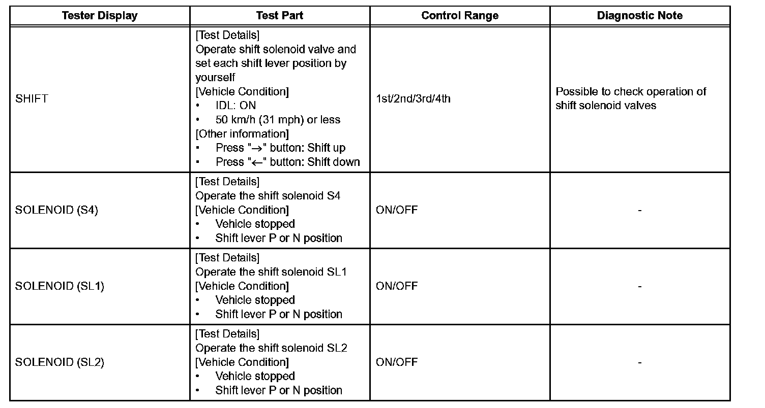 HINT: *: "SOLENOID (SLT)" in the ACTIVE TEST is performed to check the line pressure changes by connecting SST to the automatic transaxle, which is used in the HYDRAULIC TEST as well. Hydraulic Test