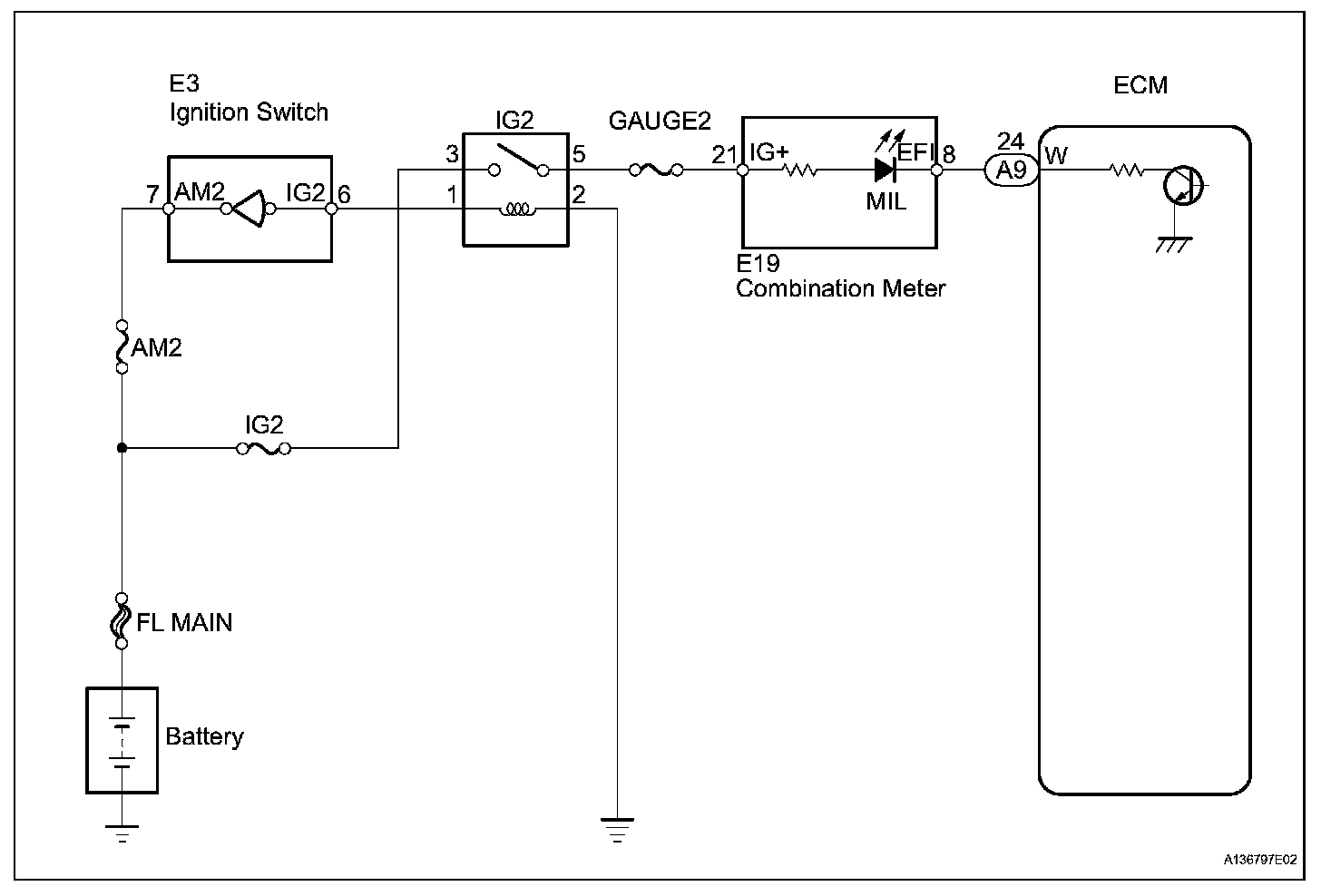 The MIL (Malfunction Indicator Lamp) is used to indicate vehicle malfunction detections by the ECM. When the ignition switch is turned ON, power is supplied to the MIL circuit, and the ECM provides the circuit ground which illuminates the MIL.