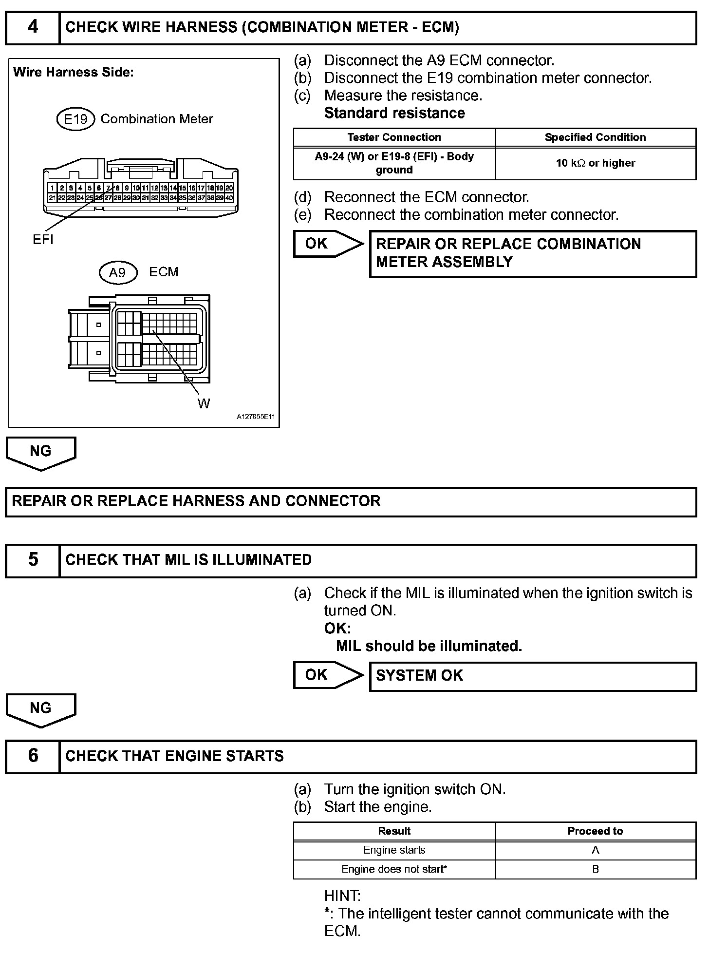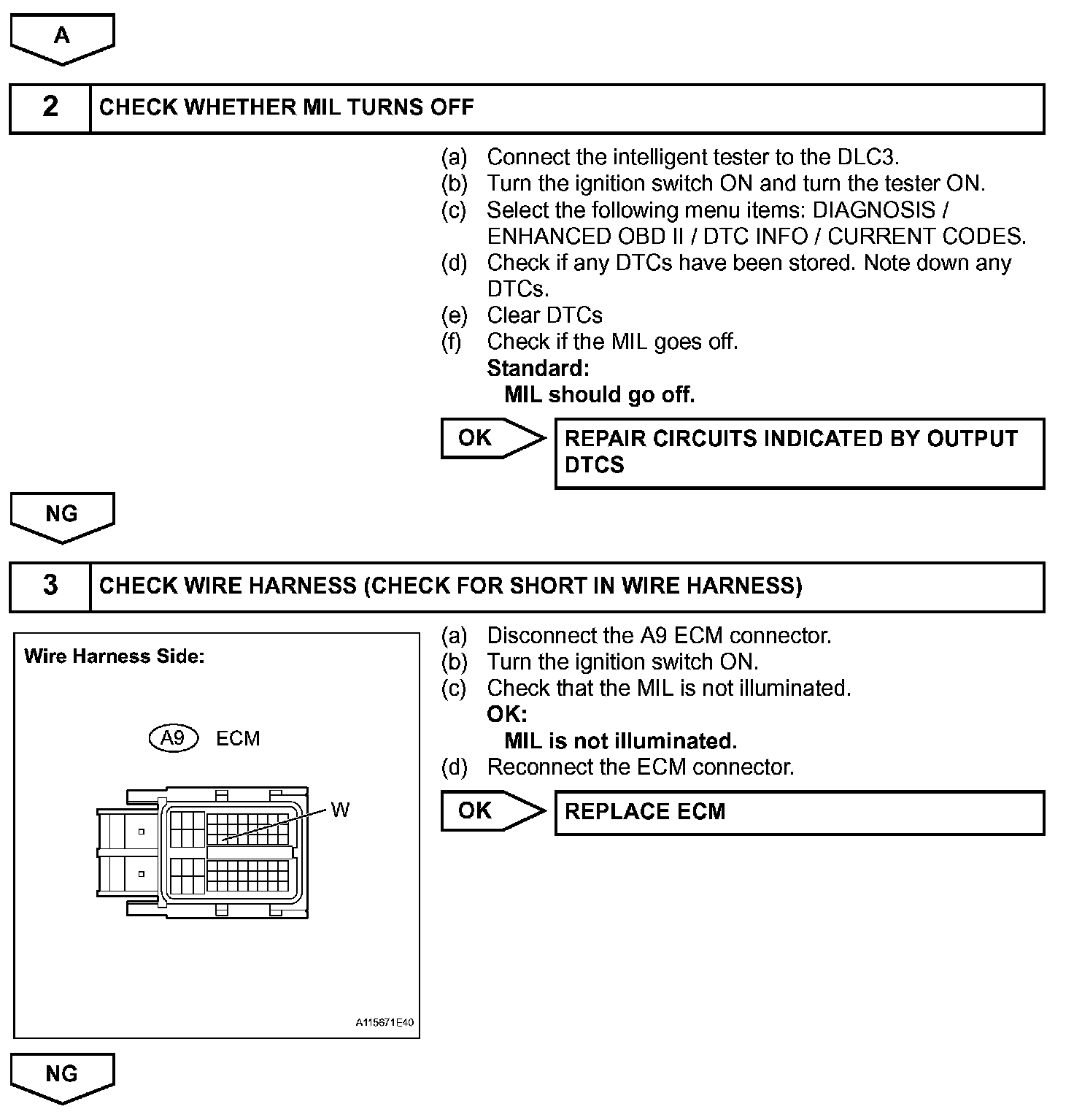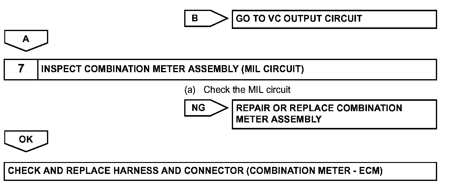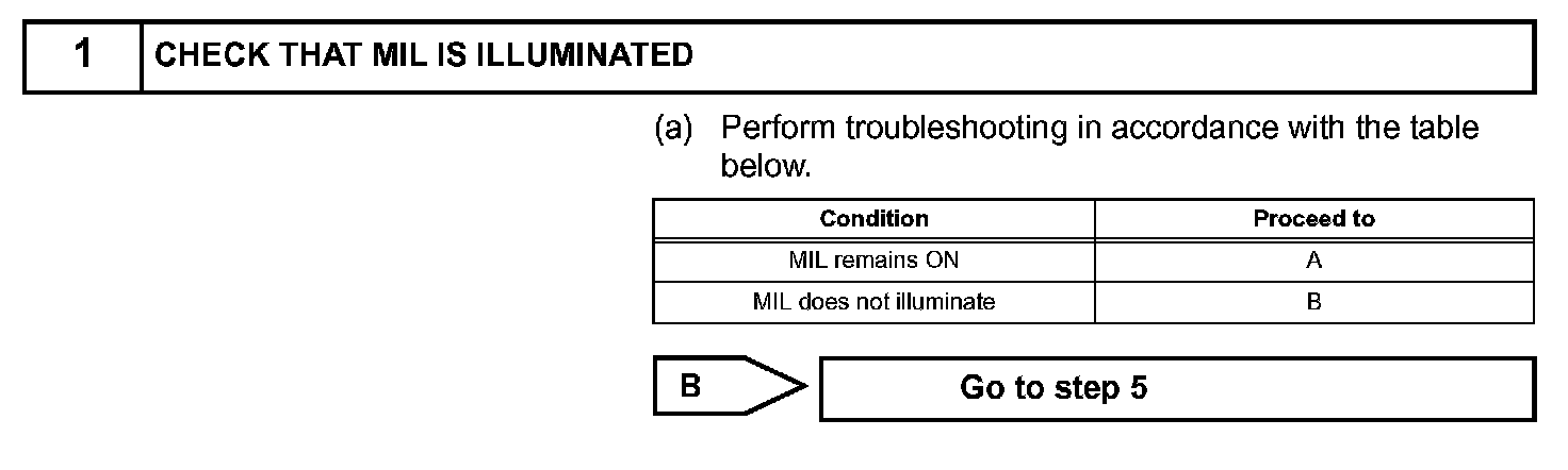 The MIL operation can be checked visually: When the ignition switch is first turned ON, the MIL should be illuminated and should then turn off. If the MIL remains illuminated or is not illuminated, conduct the following troubleshooting procedure using the intelligent tester.