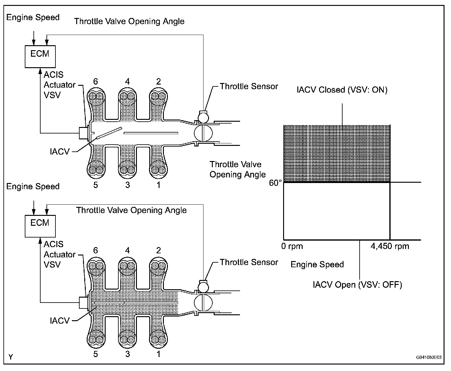 When the engine speed is between 0 and 4,450 rpm and the throttle valve opening angle is 60° or more, the ECM supplies current to the VSV (ON status), to close the IACV. Under other conditions, the VSV is usually OFF and the IACV is open.