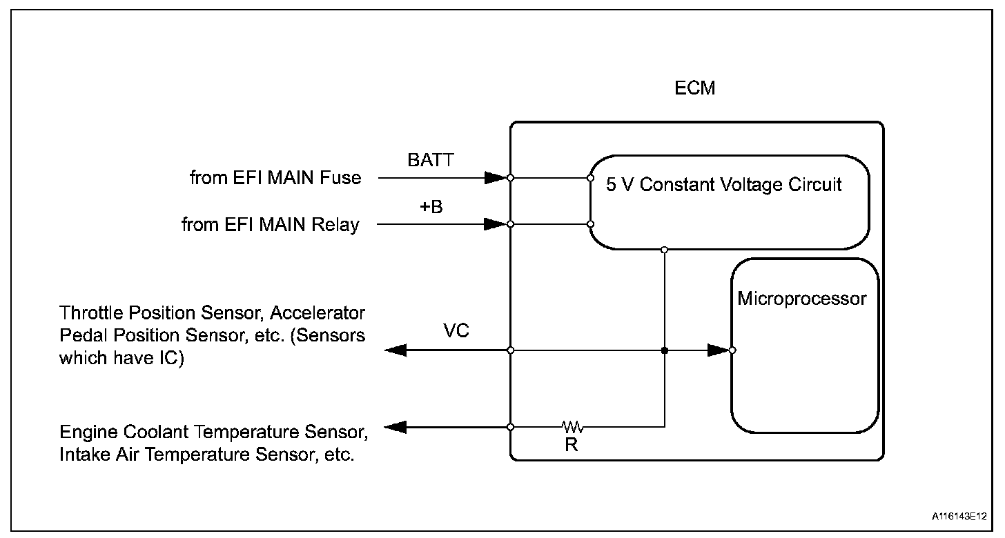 The ECM constantly generates 5 V power from the battery voltages supplied to the +B (BATT) terminal to operate the microprocessor. The ECM also provides this power to the sensors through the VC output circuit.