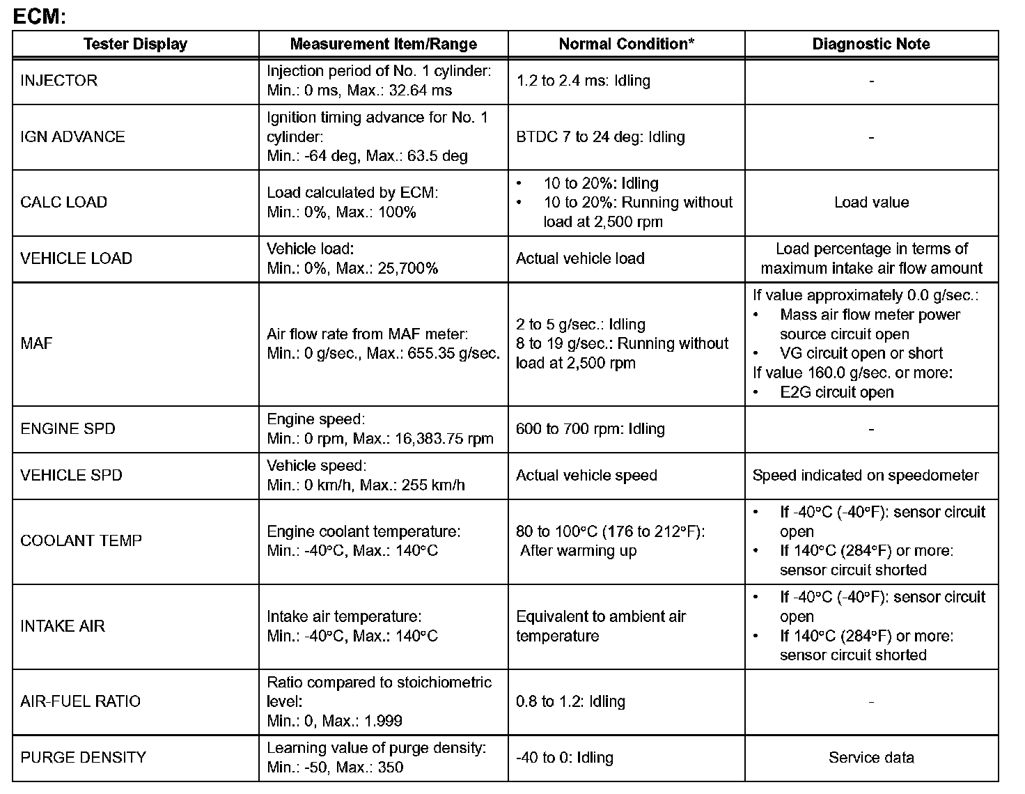 NOTE: In the table given, the values listed under Normal Condition are for reference only. Do not depend solely on these values when determining whether or not a part is faulty.