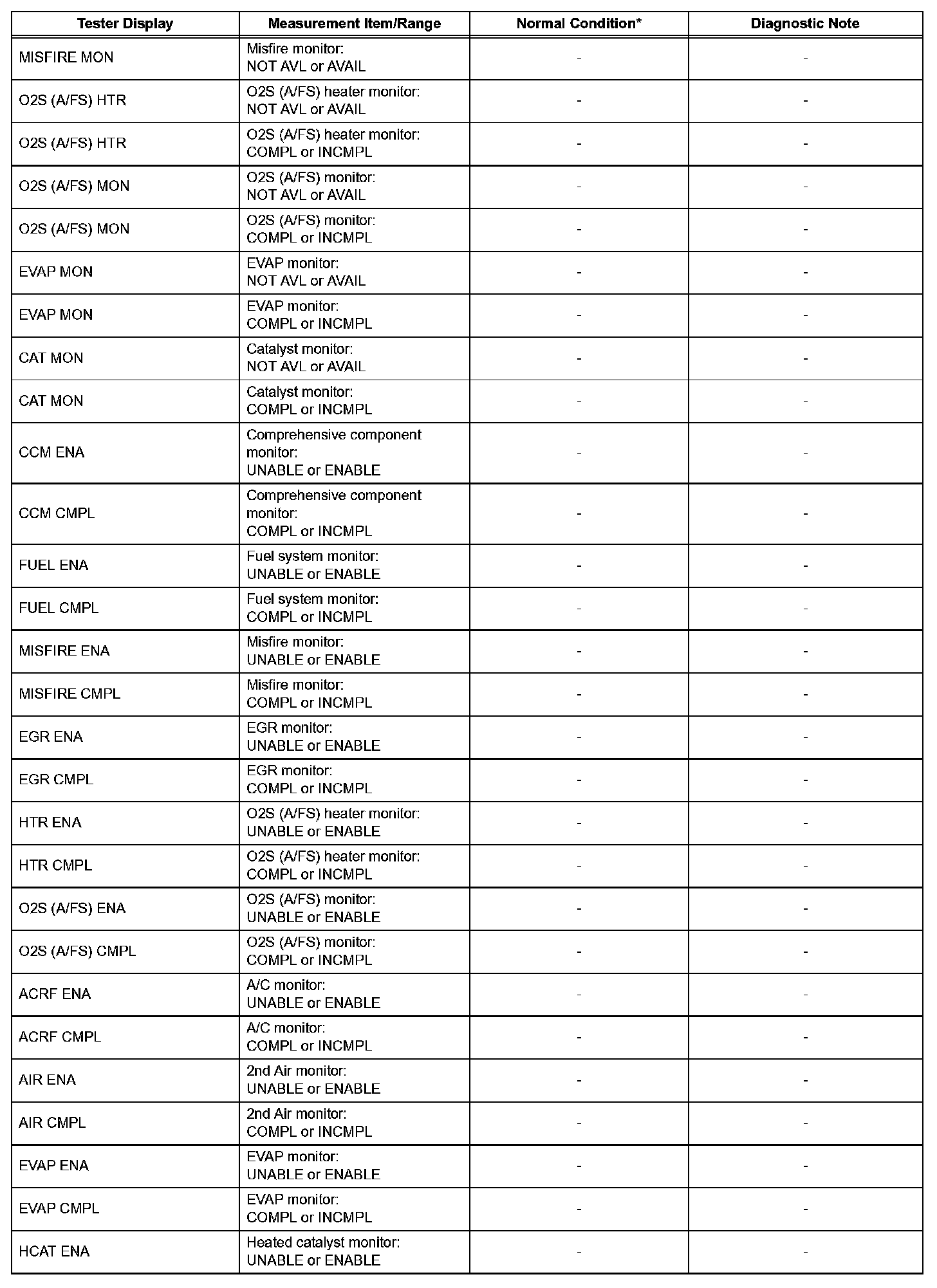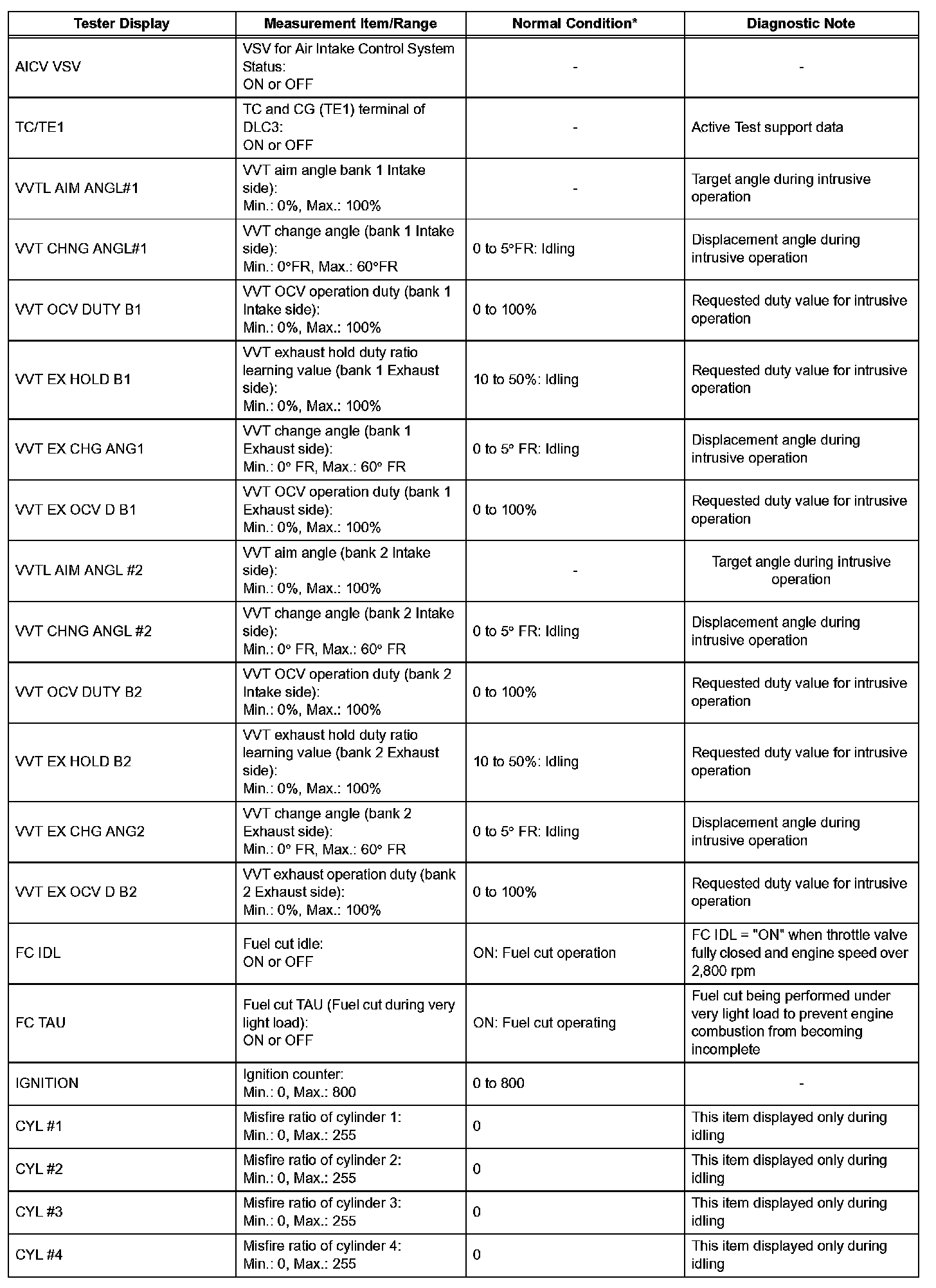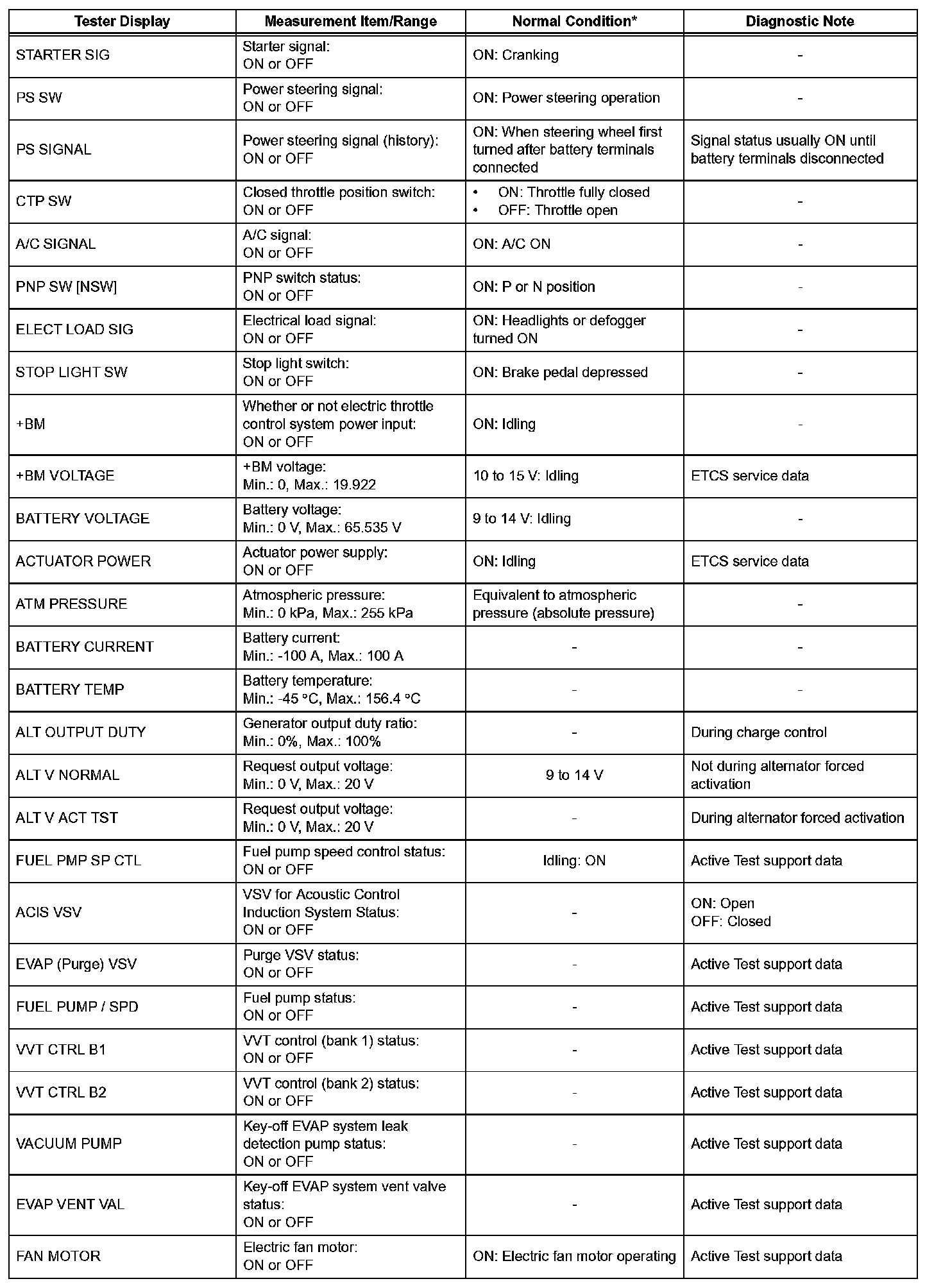 DATA LISTHINT: By reading the DATA LIST displayed on the intelligent tester, values can be checked, including those of the switches, sensors, and actuators, without removing any parts. Reading the DATA LIST as the first step of troubleshooting is one method of shortening diagnostic time.