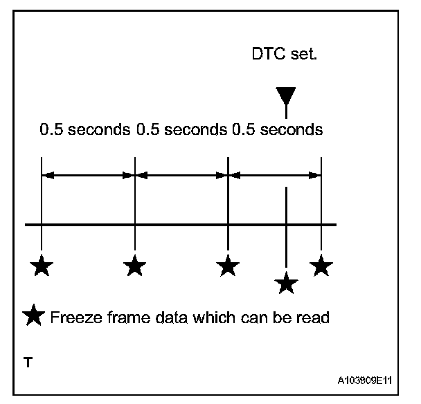 HINT: If it is impossible to duplicate the problem even though a DTC is detected, confirm the freeze frame data. The ECM records engine conditions in the form of freeze frame data every 0.5 seconds. Using the intelligent tester, 5 separate sets of freeze frame data can be checked.