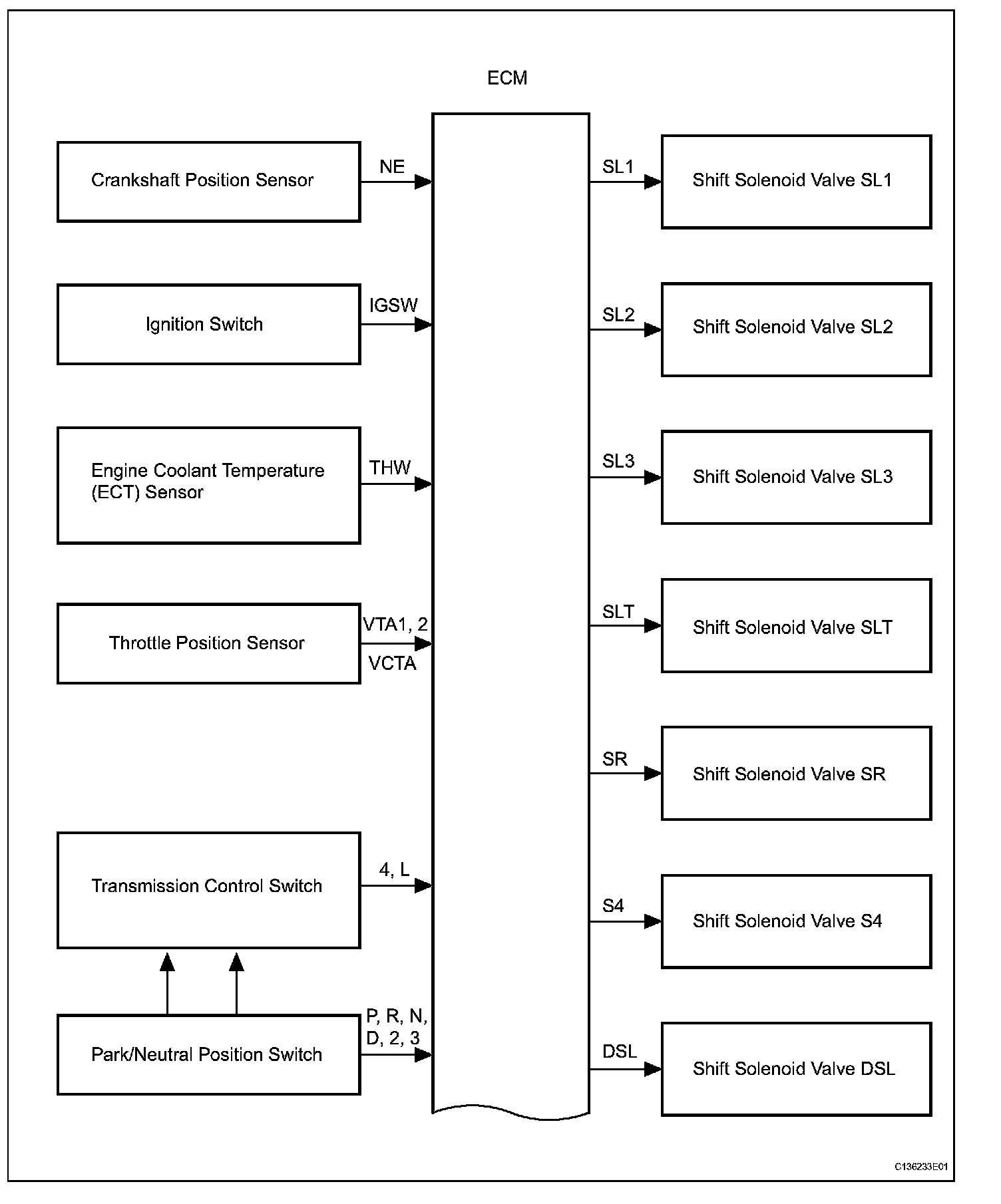(a) The Electronic Controlled Automatic Transaxle (ECT) is an automatic transaxle that electronically controls shift timing using the Engine Control Module (ECM). The ECM detects electrical signals that indicate engine and driving conditions, and controls the shift point based on driver habits and road conditions. As a result, fuel efficiency and power transaxle performance are improved.