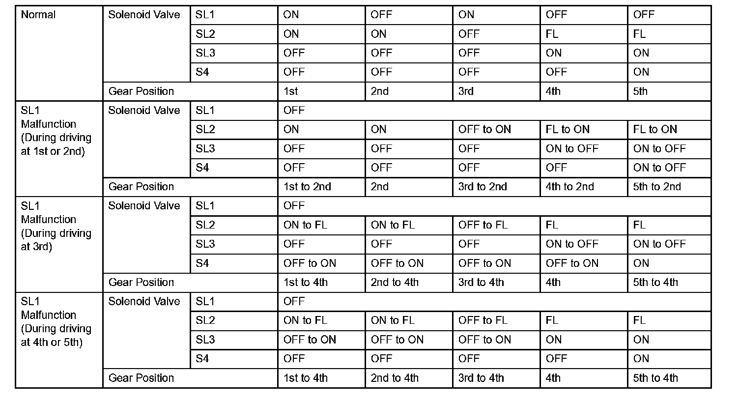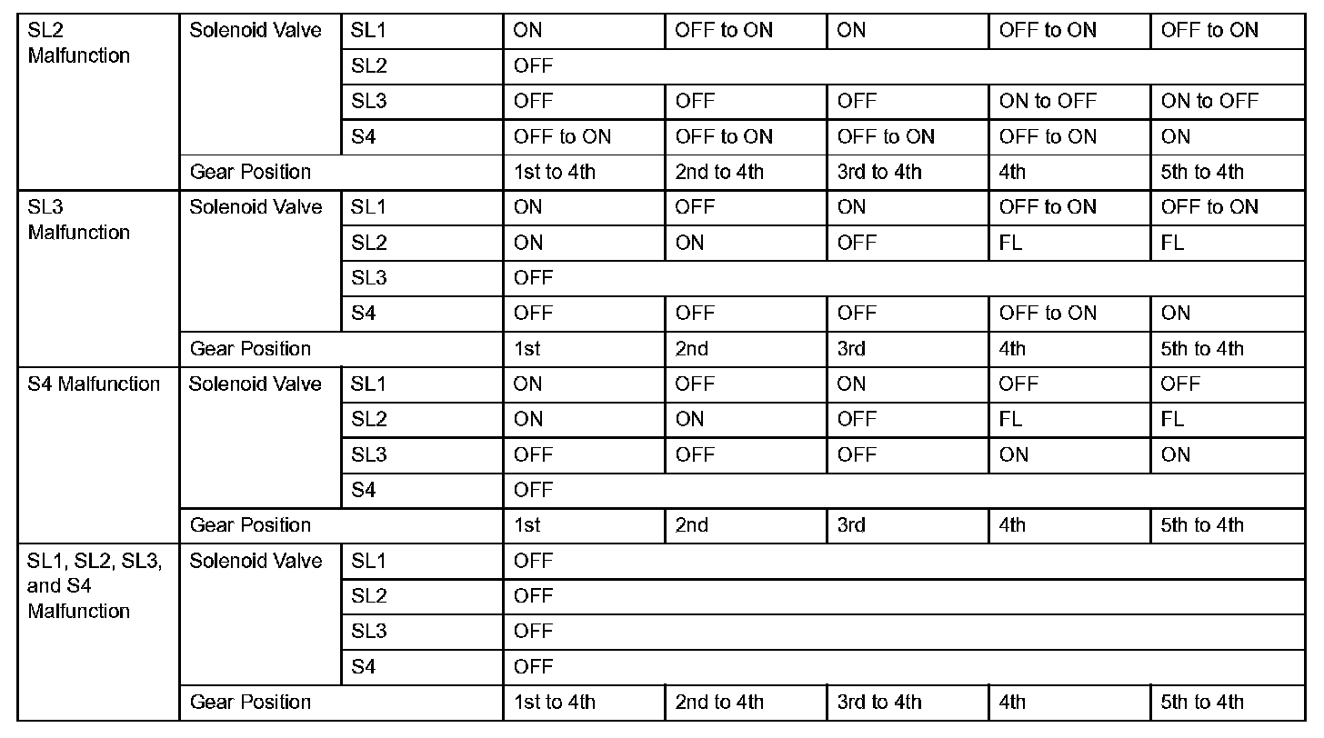 (d) Shift solenoid valve SL1, SL2, SL3 and S4: If any of the shift solenoid valve circuits develops an open or short, the ECM turns the other shift solenoid "ON" and "OFF" in order to shift into the gear positions shown in the table.
