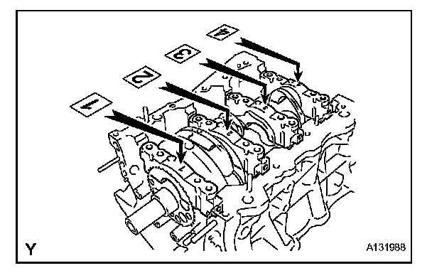 Confirm the front marks and numbers of the main bearing caps and install the bearing caps on the cylinder block.