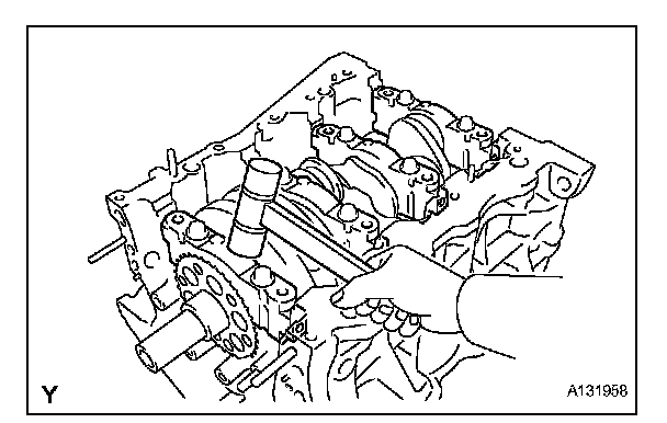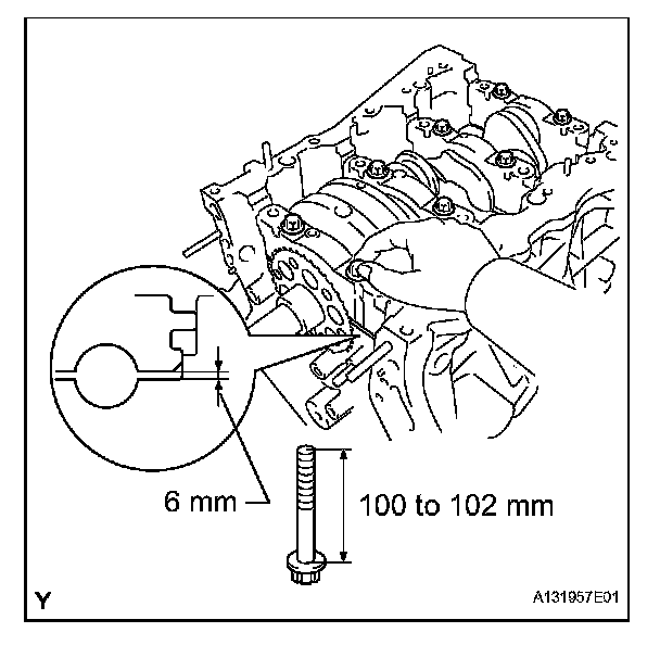 Insert the main bearing cap by hand until the clearance between the main bearing cap and the cylinder block is less than 6 mm (0.23 inch) by marking the 2 internal bearing cap bolts as a guide.
