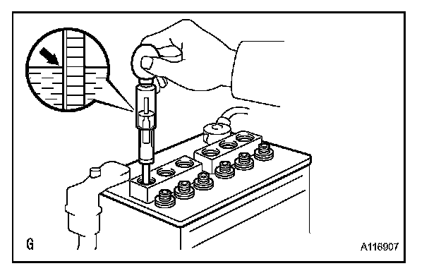 If the electrolyte quantity is the lower line, add distilled water to each cell. Then, recharge the battery and check the electrolyte's specific gravity.