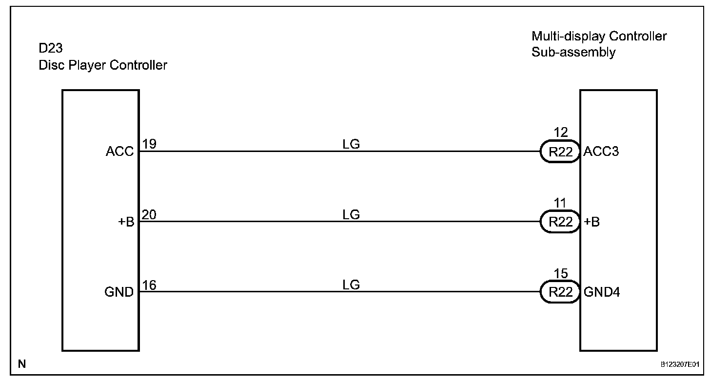 Disc Player Controller Power Source CircuitDESCRIPTIONThis circuit provides power to the disc player controller. The power is sent from the battery to the disc player controller through the multi-display controller sub-assembly.