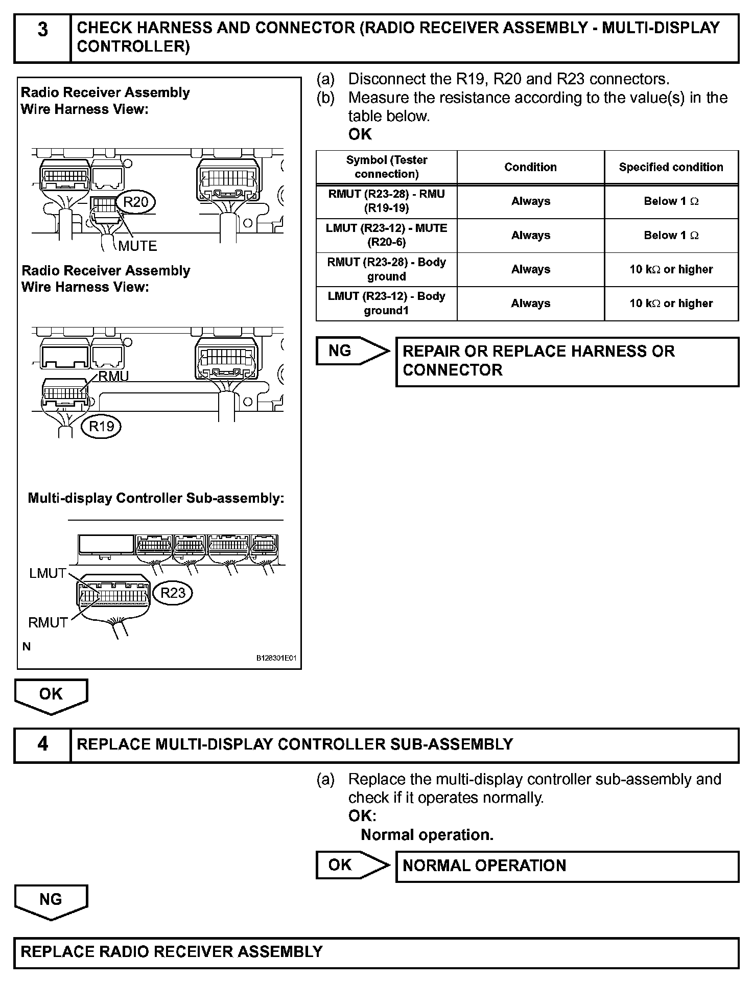 The multi-display controller sub-assembly controls the volume according to the MUTE signal from the radio receiver assembly or radio and navigation assembly.