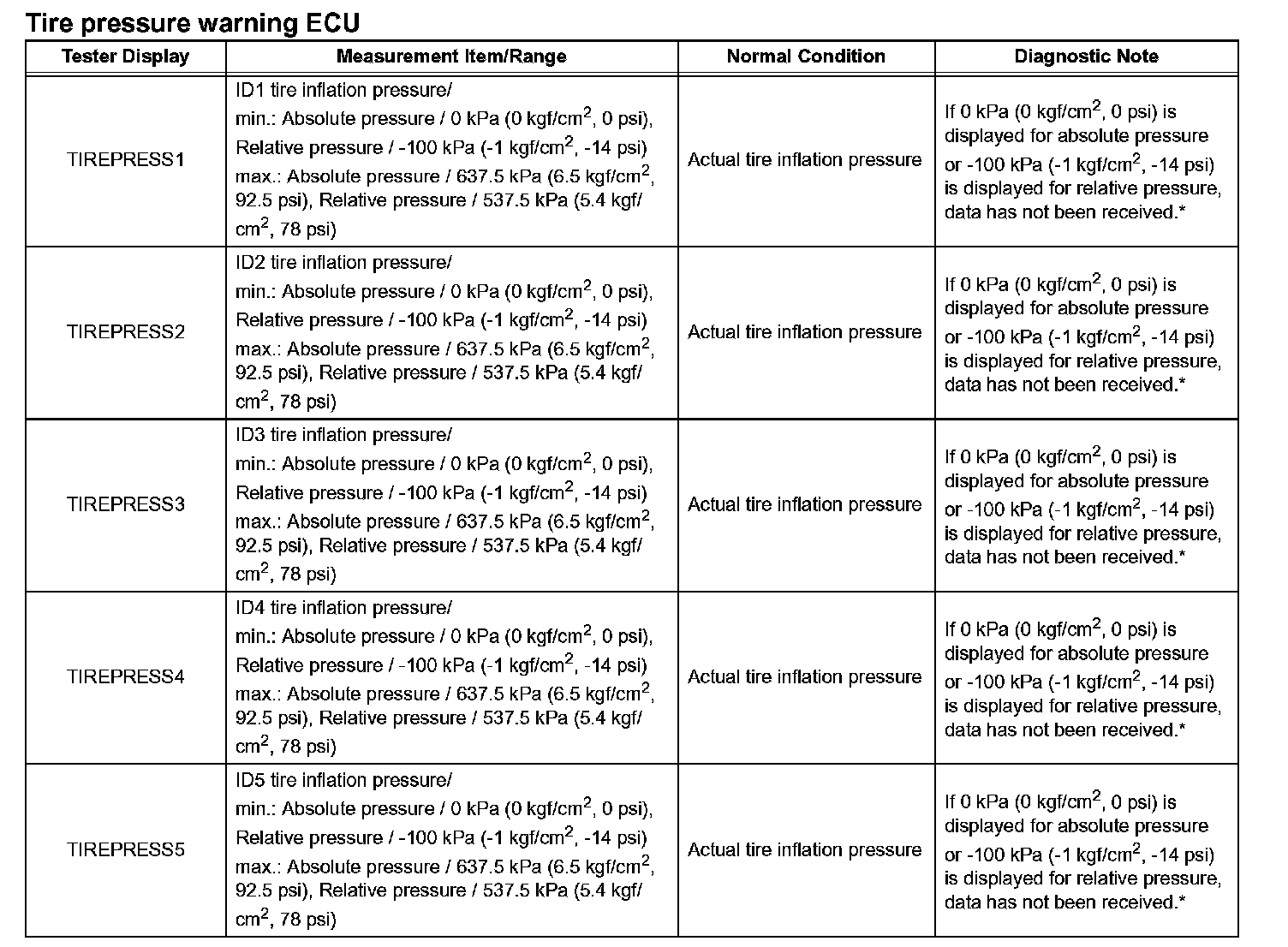 - The initialization is complete when the DATA LIST "TIREPRESS" display shows the correct pressures.