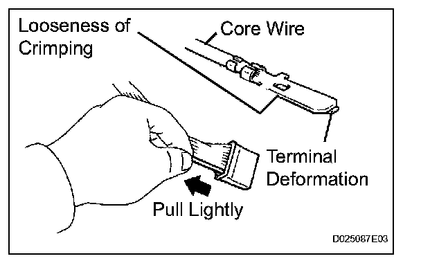 Check by pulling the wire harness lightly from the backside of the connector. Look for unlatched terminals, missing terminals, loose crimps or broken conductor wires. Check visually for corrosion, metallic or foreign matter and water, and bent, rusted, overheated, contaminated, or deformed terminals.