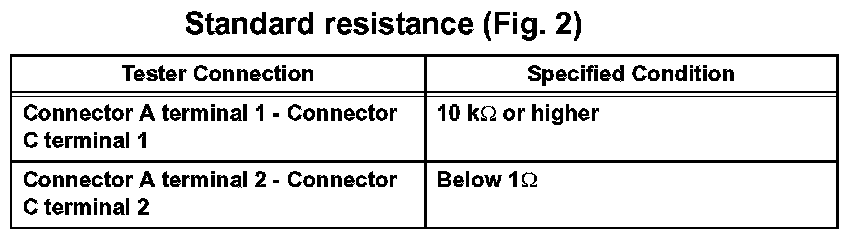 HINT: Measure the resistance while lightly shaking the wire harness vertically and horizontally. If the results match the examples, an open circuit exists between terminal 1 of connector A and terminal 1 of connector C.