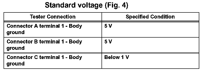 1. In a circuit in which voltage is applied to the ECU connector terminal, an open circuit can be checked by conducting a voltage check.With each connector still connected, measure the voltage between the body ground and these terminals (in this order): 1) terminal 1 of connector A, 2) terminal 1 of connector B, and 3) terminal 1 of connector C.