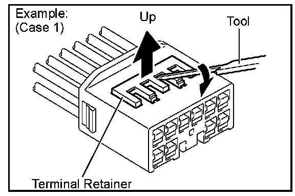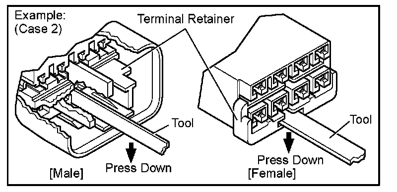 Insert the special tool into the terminal retainer access hole (Mark) and pull the terminal retainer up to the temporary lock position.