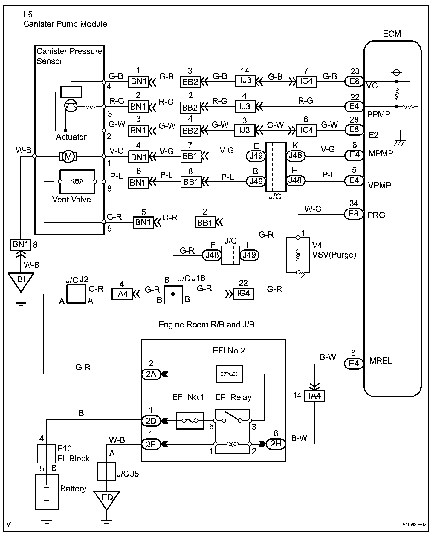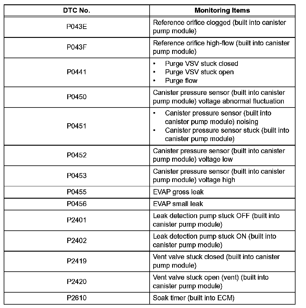 The leak detection pump creates negative pressure (vacuum) in the EVAP system and the pressure is measured. Finally, the ECM monitors for leaks from the EVAP system and malfunctions in both the canister pump module and purge VSV, based on the EVAP pressure.