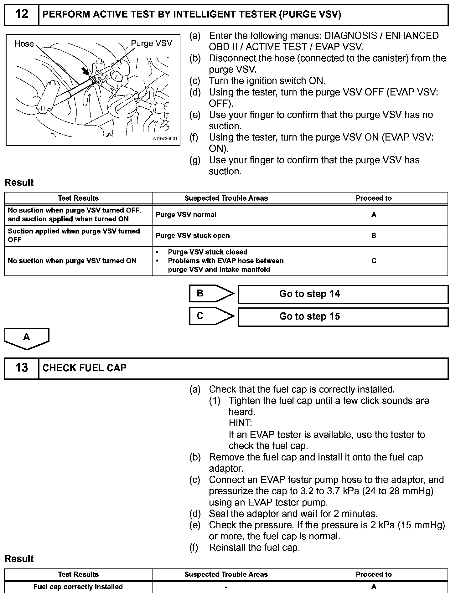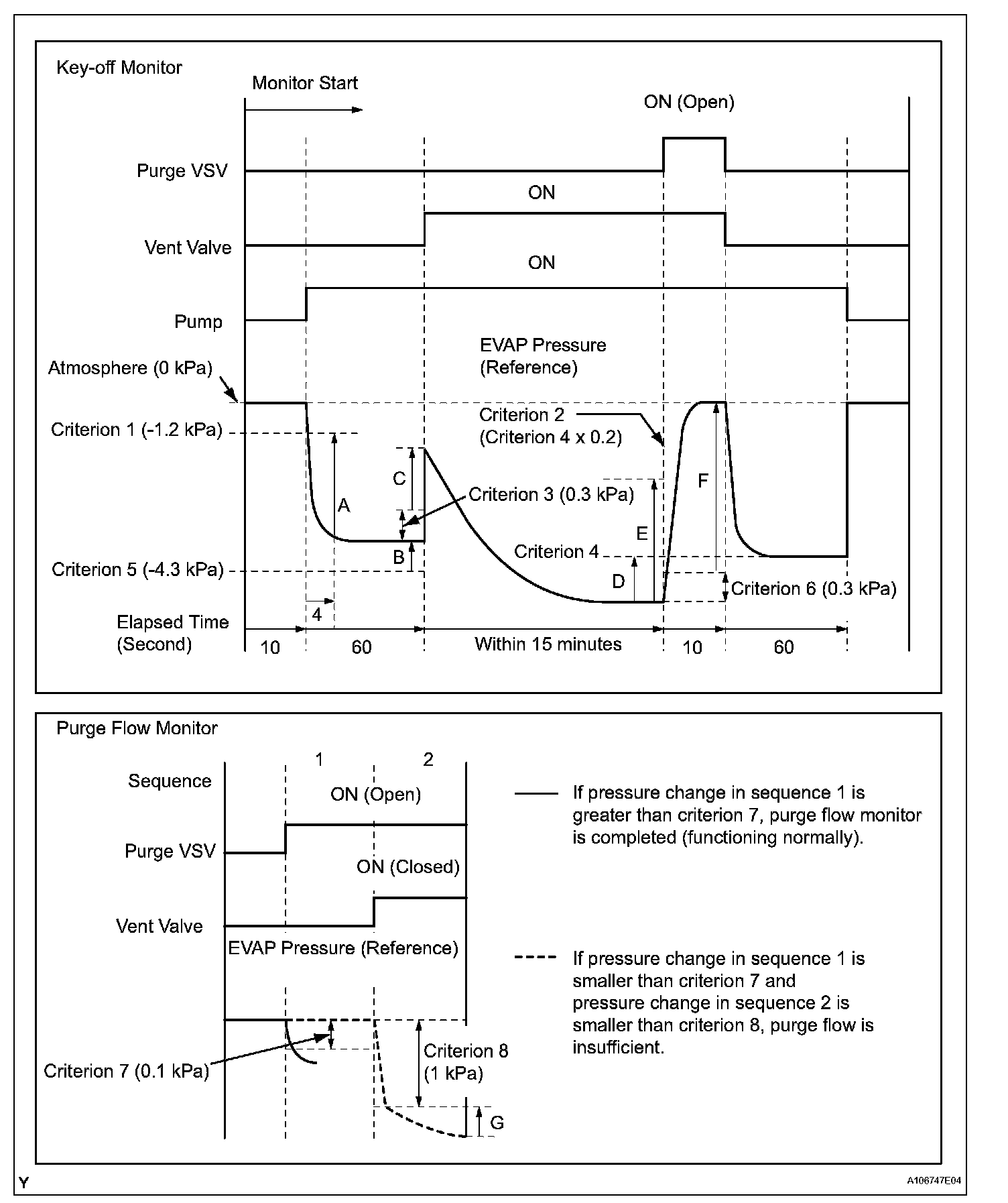 Wile the engine is running and the purge Vacuum Switching Valve (VSV) is ON (open), the ECM monitors the purge flow by measuring the EVAP pressure change. If negative pressure is not created, the ECM begins the 2nd monitor.