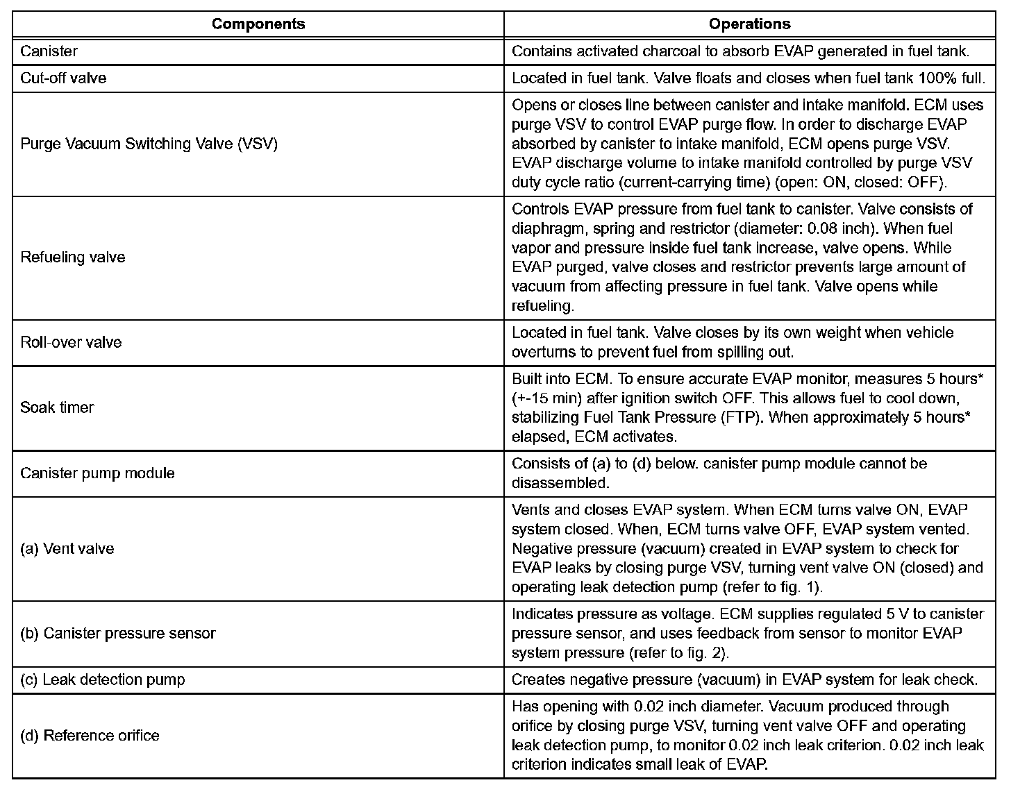 This monitor checks for Evaporative Emission (EVAP) system leaks and canister pump module malfunctions. The monitor starts 5 hours* after the ignition switch is turned OFF. More than 5 hours are required to allow the fuel to cool down to stabilize the Fuel Tank Pressure (FTP), thus making the EVAP system monitor more accurate.