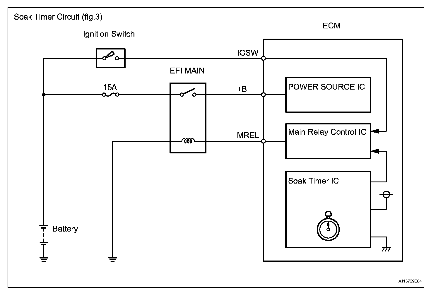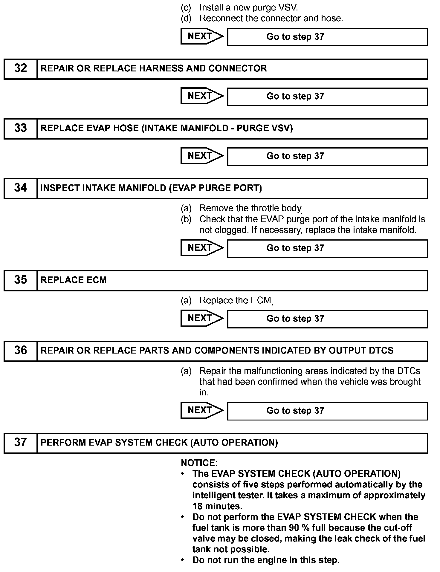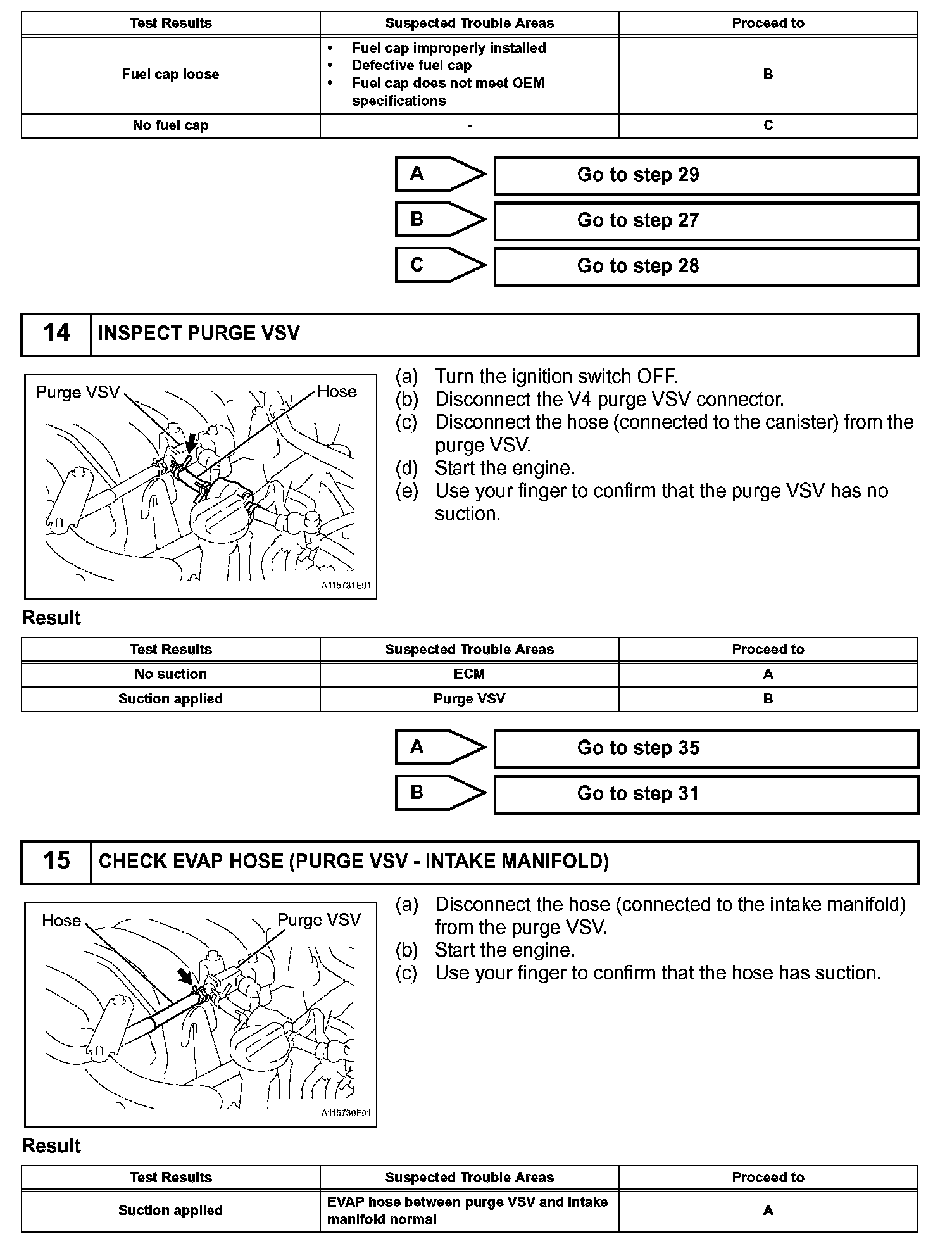 While the engine is running, if a predetermined condition (closed-loop etc.) is met, the purge VSV is opened by the ECM and stored fuel vapors in the canister are purged to the intake manifold. The ECM changes the duty cycle ratio of the purge VSV to control purge flow volume.