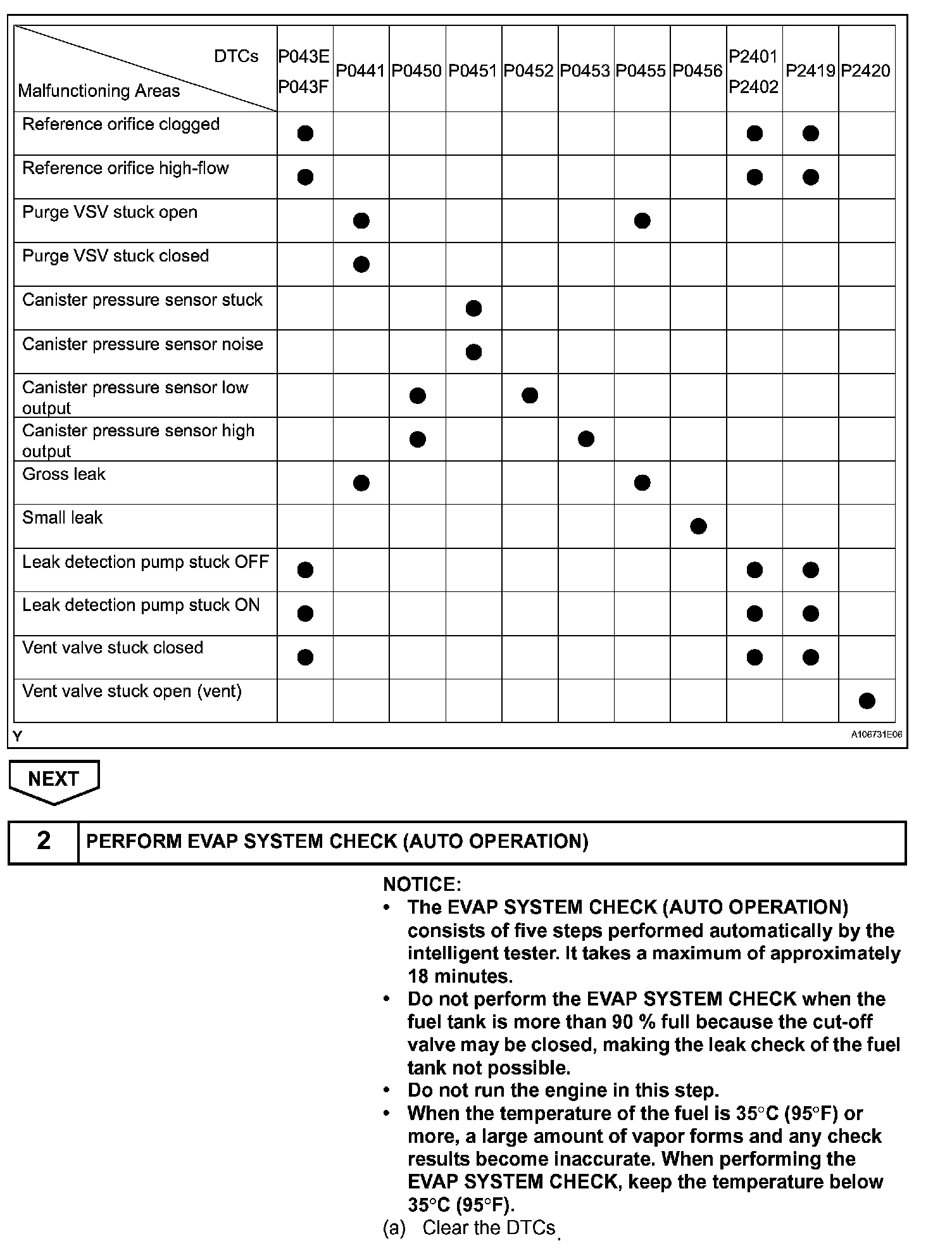 If any EVAP system DTCs are set, the malfunctioning area can be determined using the table.