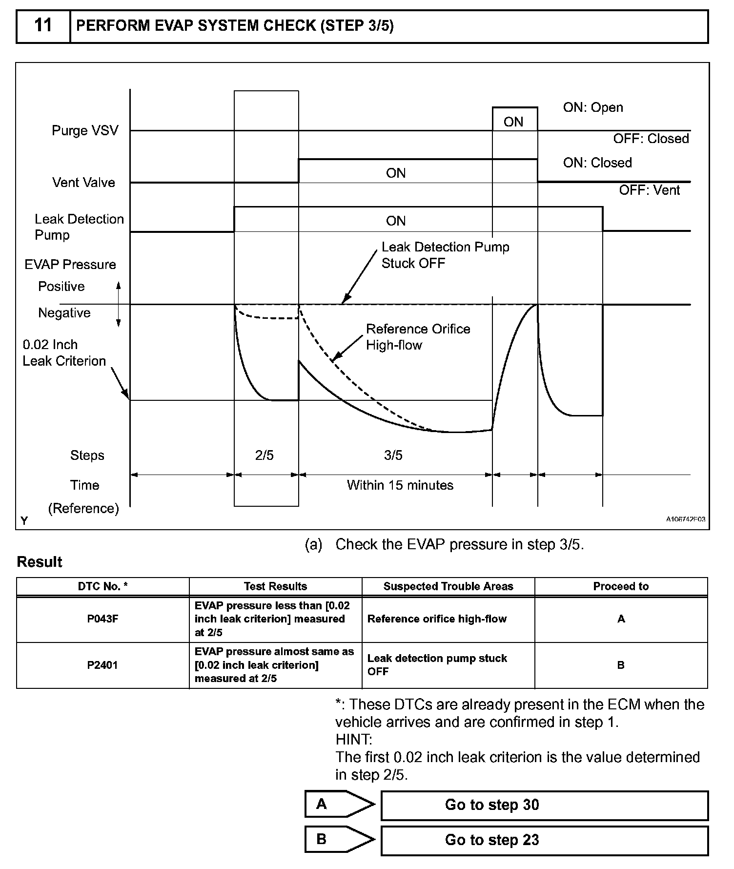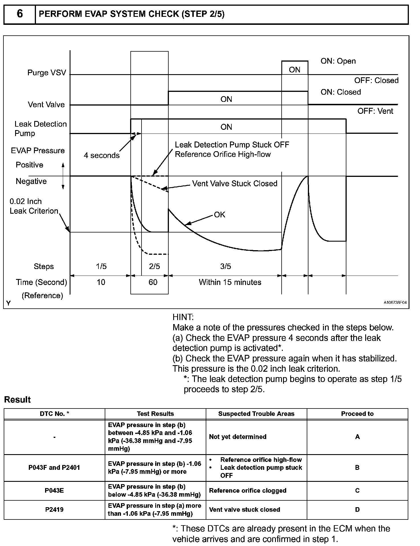 NOTE: If the 0.02 inch leak criterion difference between the first and second checks is greater than the specification, the DTCs corresponding to the 0.02 inch leak criterion (P043E, P043F, P0441, P0455, P0456, P2401 and P2420) will all be stored.