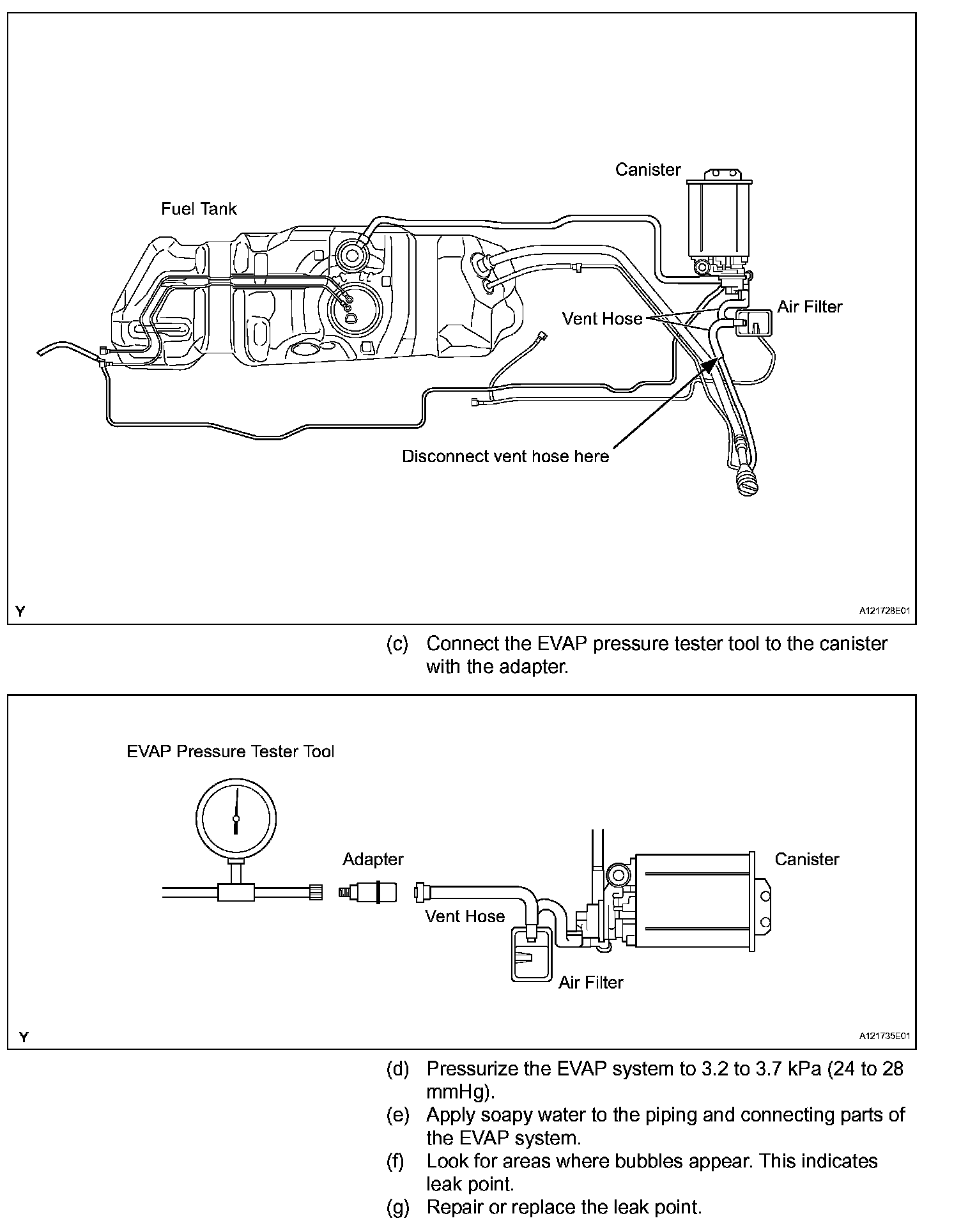 NOTE: In this vehicle's EVAP system, turning ON the vent valve does not seal off the EVAP system. To check for leaks in the EVAP system, disconnect the air inlet vent hose and apply pressure from the atmosphere side of the canister.