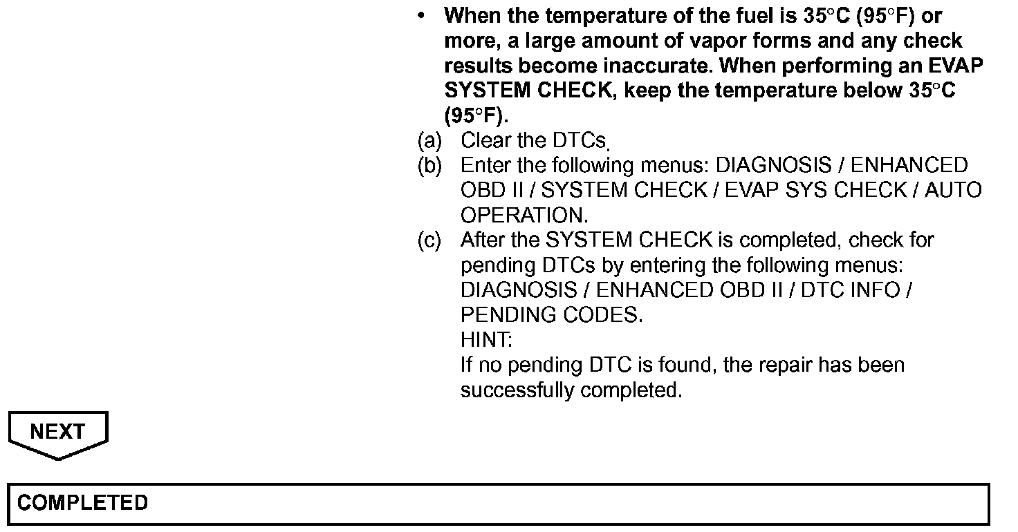 HINT: After a repair, check Monitor Status by performing the key-off monitor confirmation and purge flow monitor confirmation described.