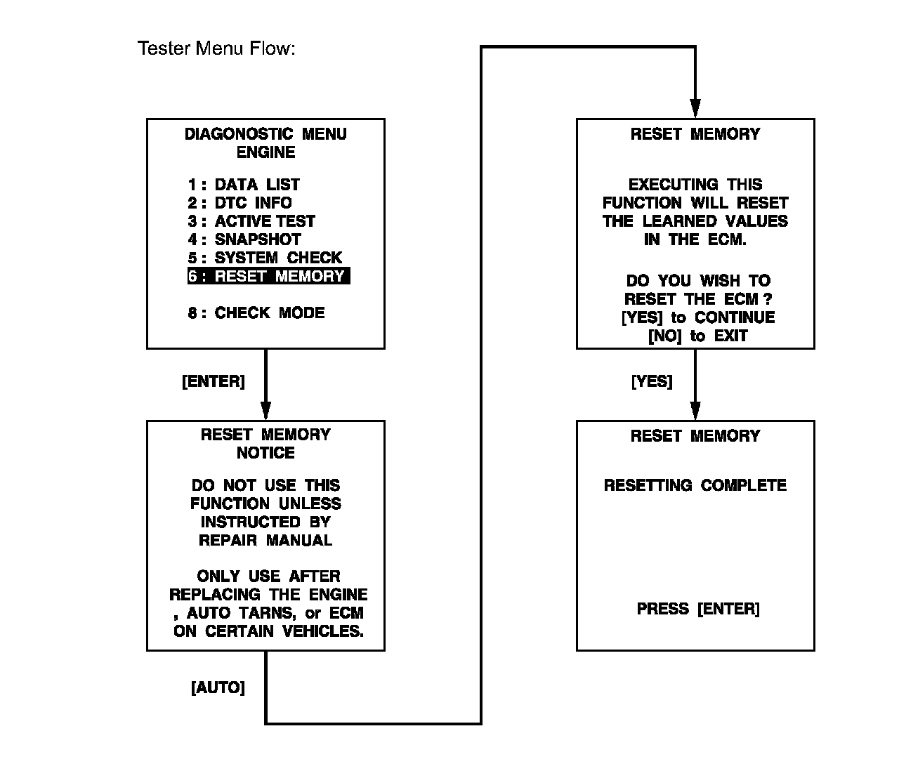 CAUTION: After performing the RESET MEMORY procedures, be sure to perform the ROAD TEST as described earlier. Road Test