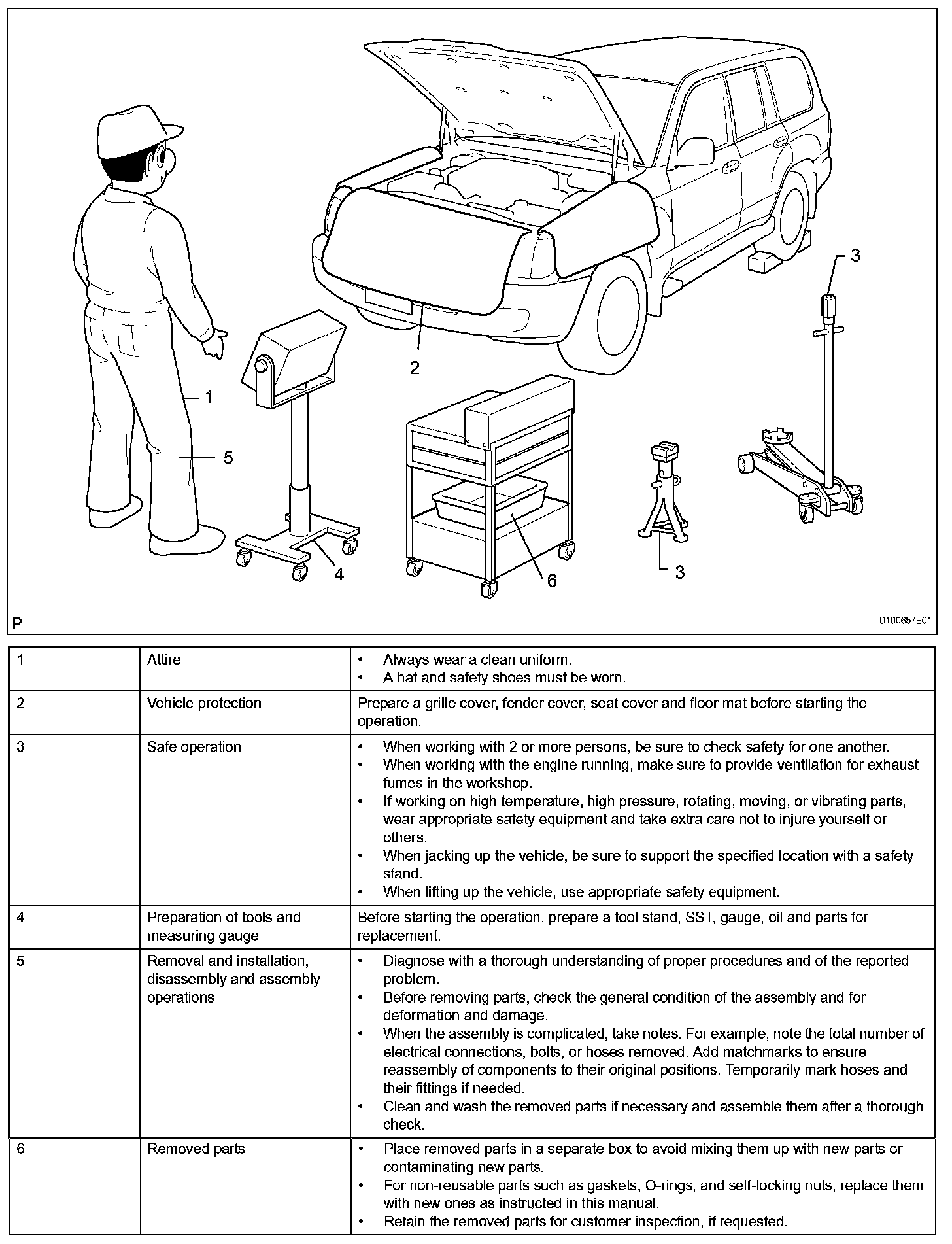 1. Care must be taken when jacking up and supporting the vehicle. Be sure to lift and support the vehicle at the proper locations.