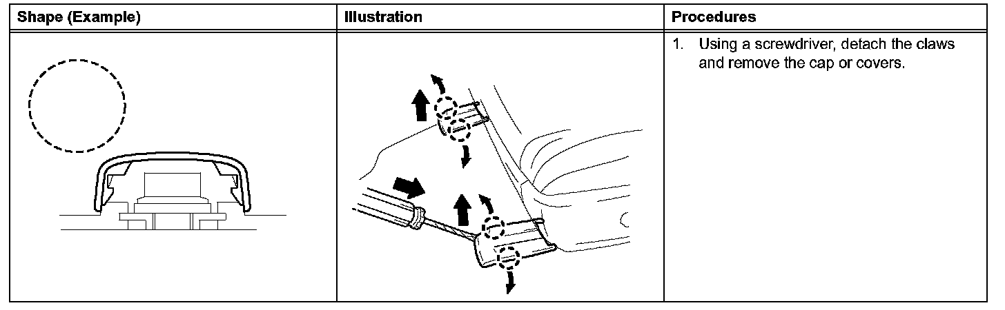 1. The removal and installation methods of typical claws used for vehicle body parts are shown in the table.