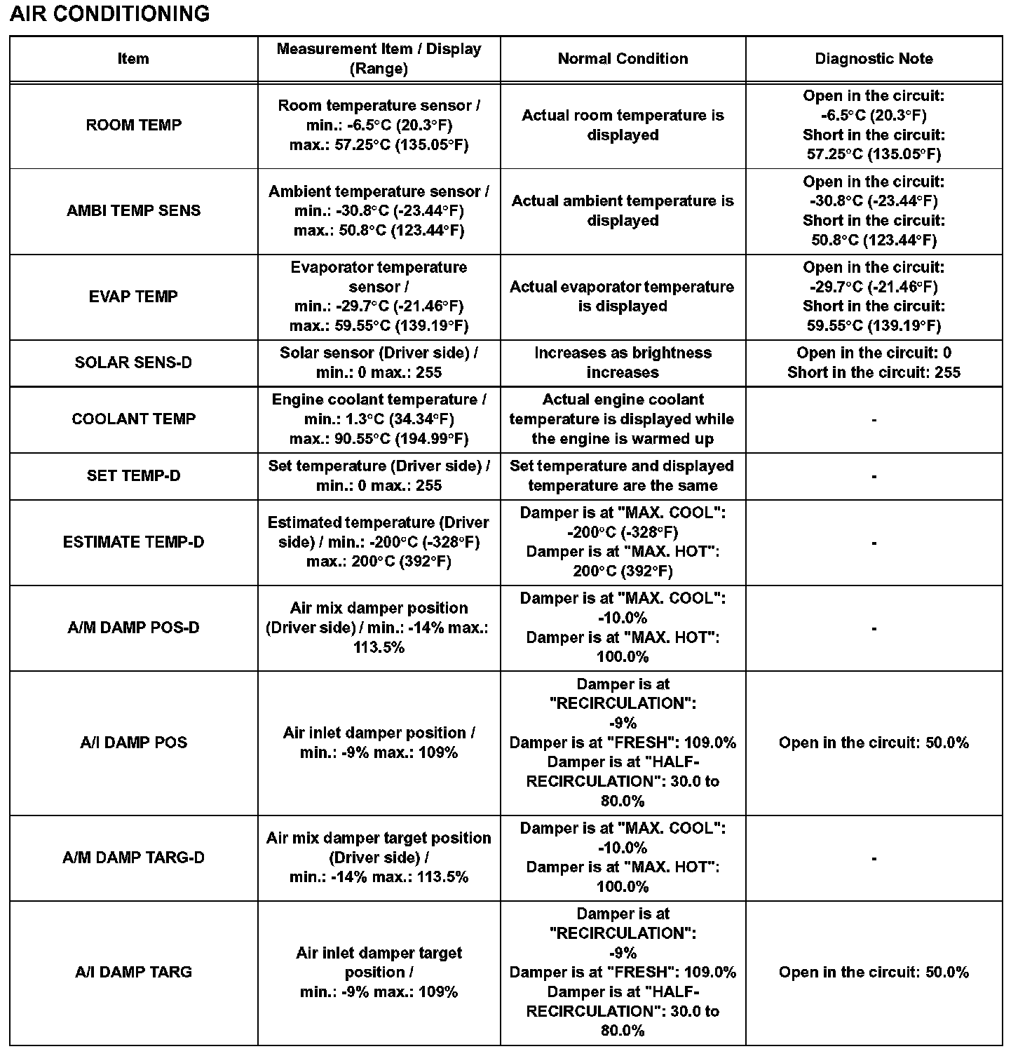 READ DATA LISTHINT: From the DATA LIST displayed on the intelligent tester, you can read the values of the displays, sensors, actuators and so on without part removal. Reading the DATA LIST as the first step of troubleshooting is one way to shorten labor time.