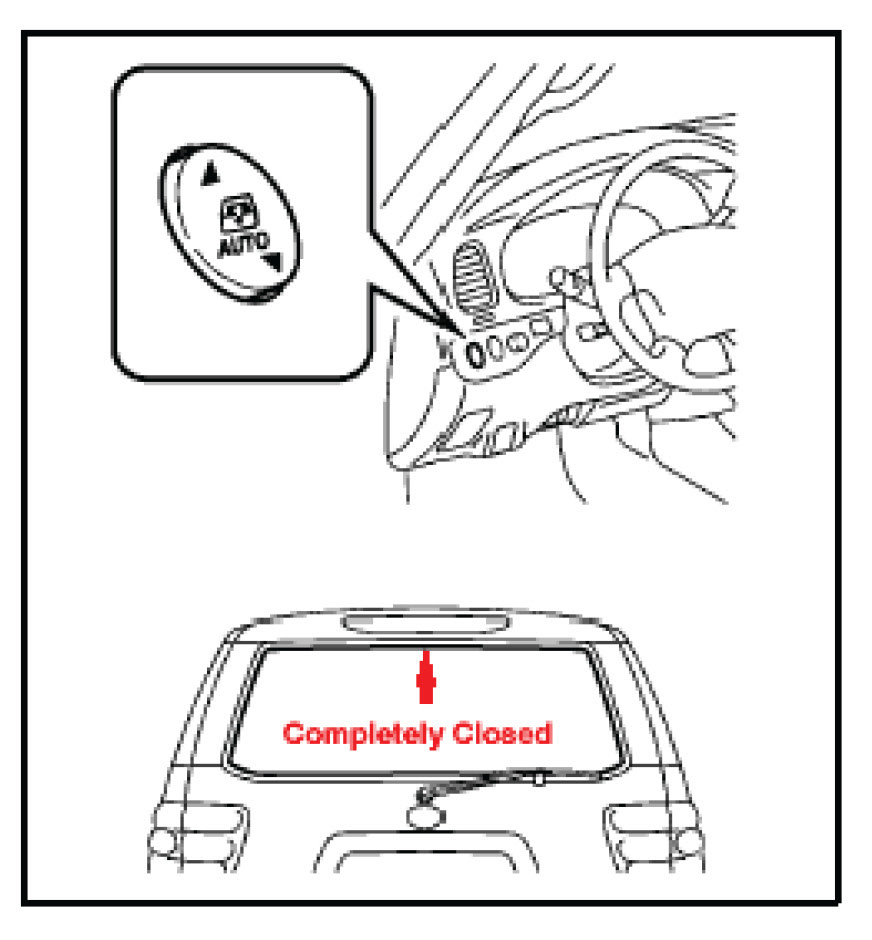 4. Push and hold the back door power window switch to the "UP" side until the window closes. Continue holding it for approximately one second.