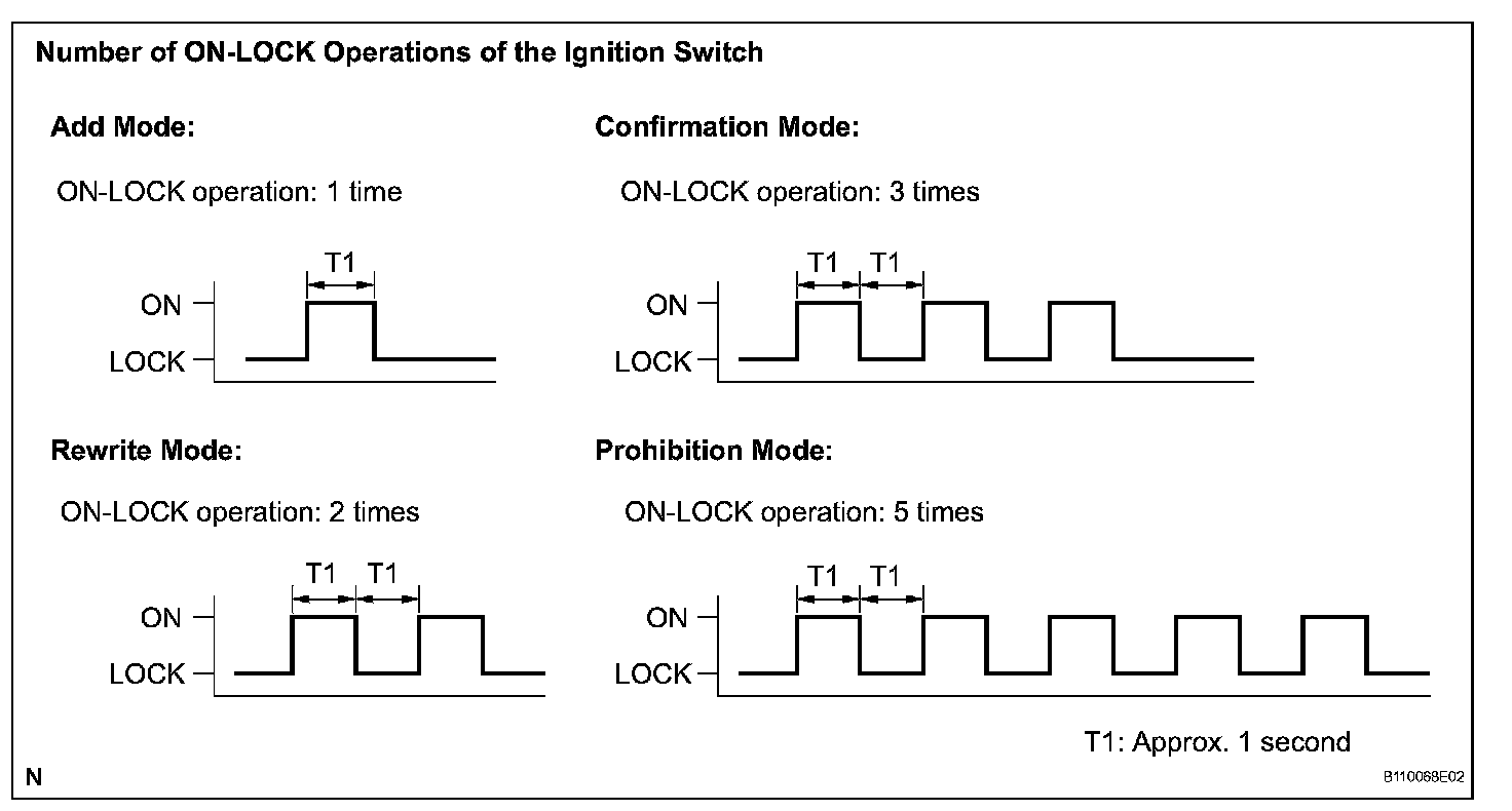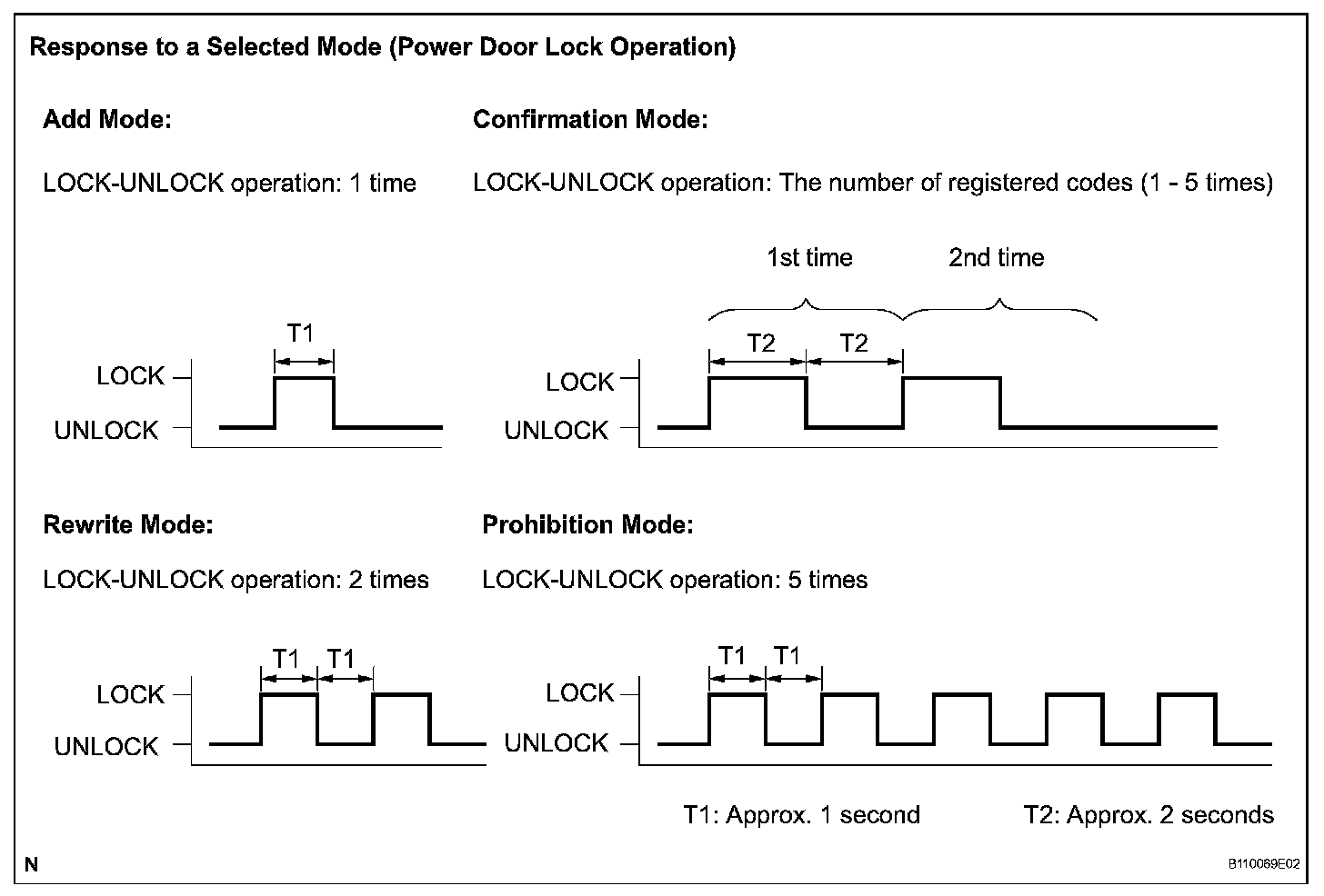 HINT: If the number of ON-LOCK operations of the ignition switch is 0, 4 or 6 or more, there will be no response (power door lock and unlock operation) to show which mode has been selected.